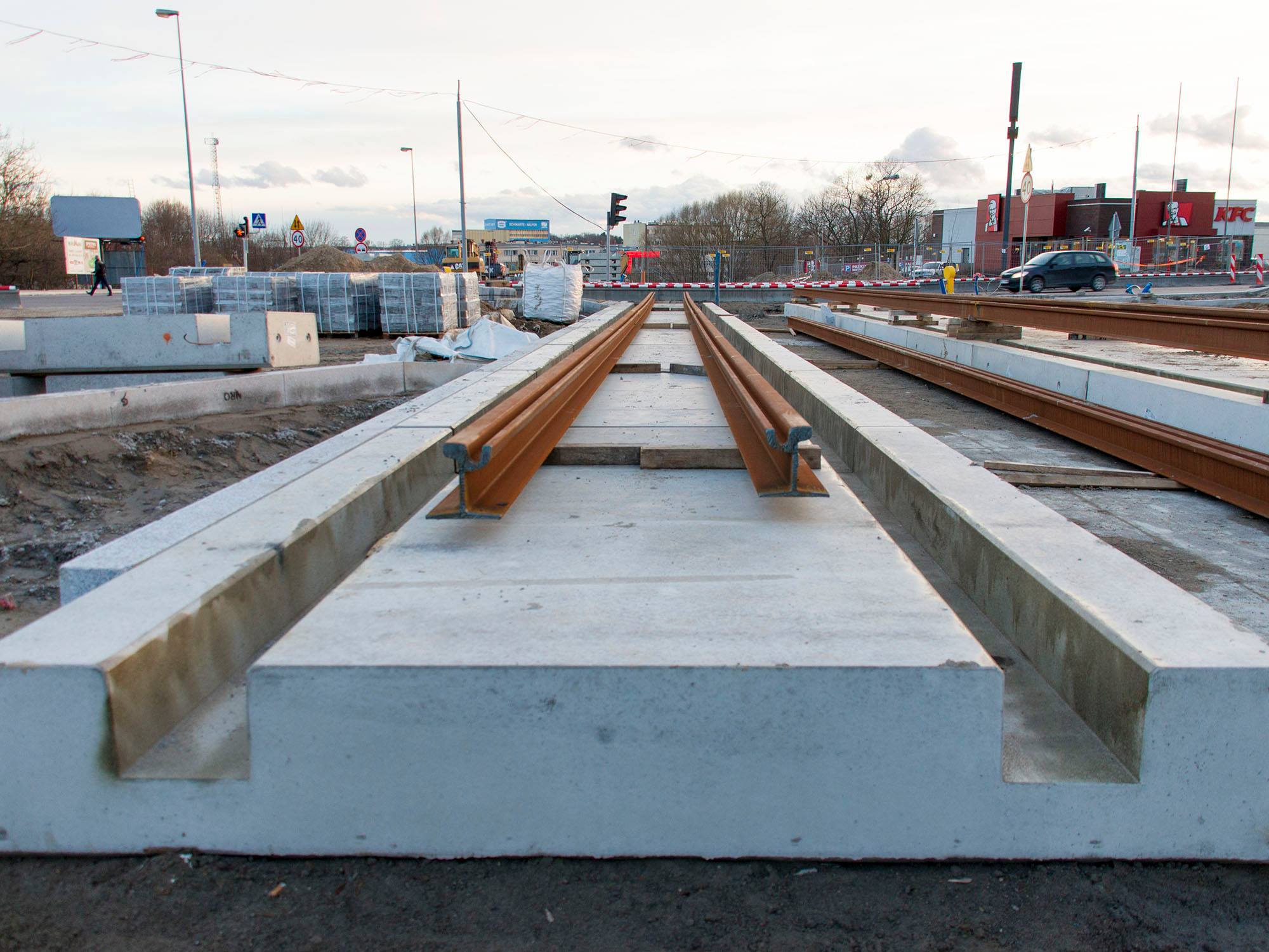 Budowa linii tramwajowej na skrzyżowaniu alei Sikorskiego oraz ulic Pstrowskiego i Obiegowej (3 kwietnia 2015)