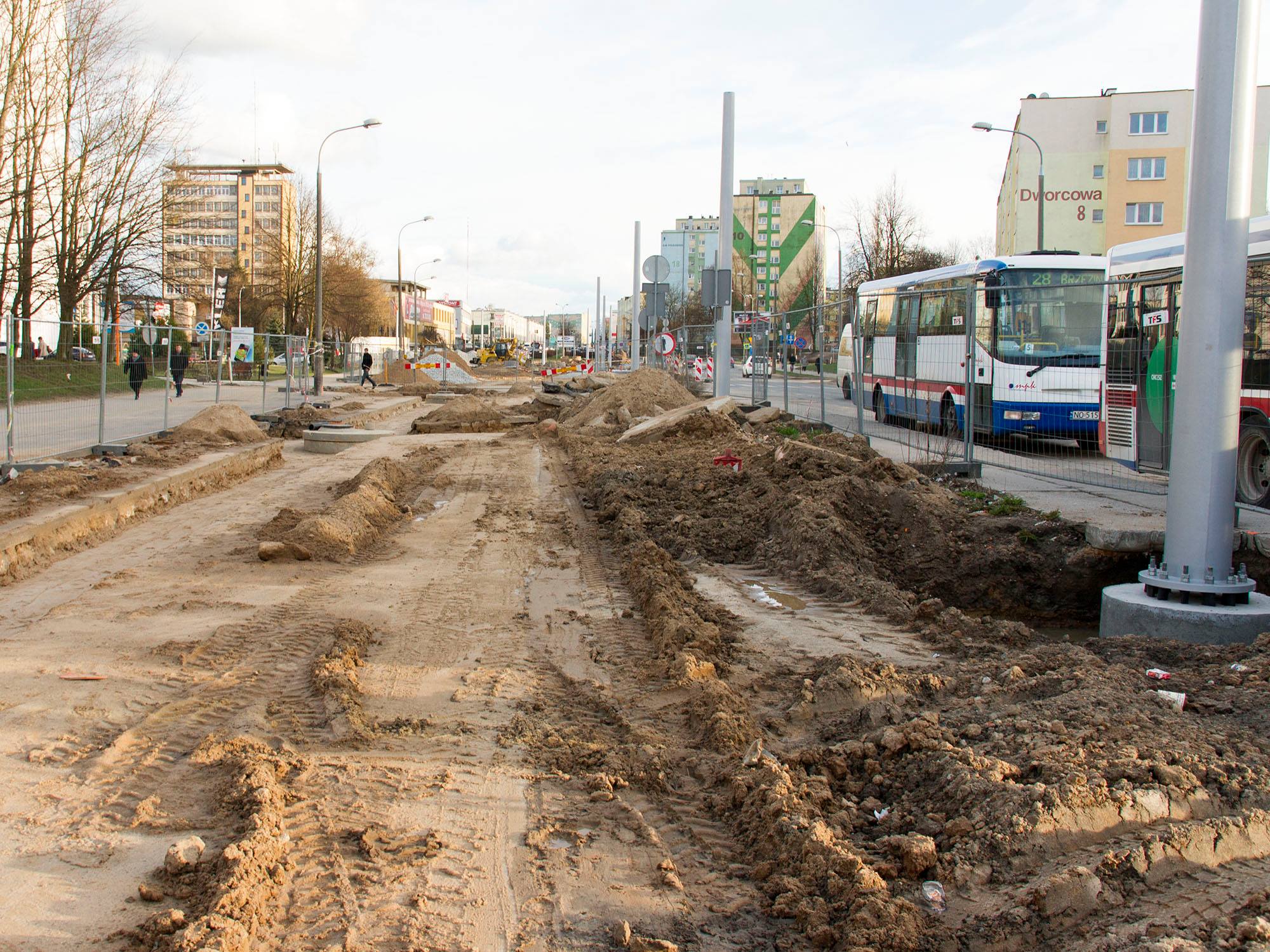 Budowa linii tramwajowej w ulicy Dworcowej (3 kwietnia 2015) Fot. Paweł Bukowski