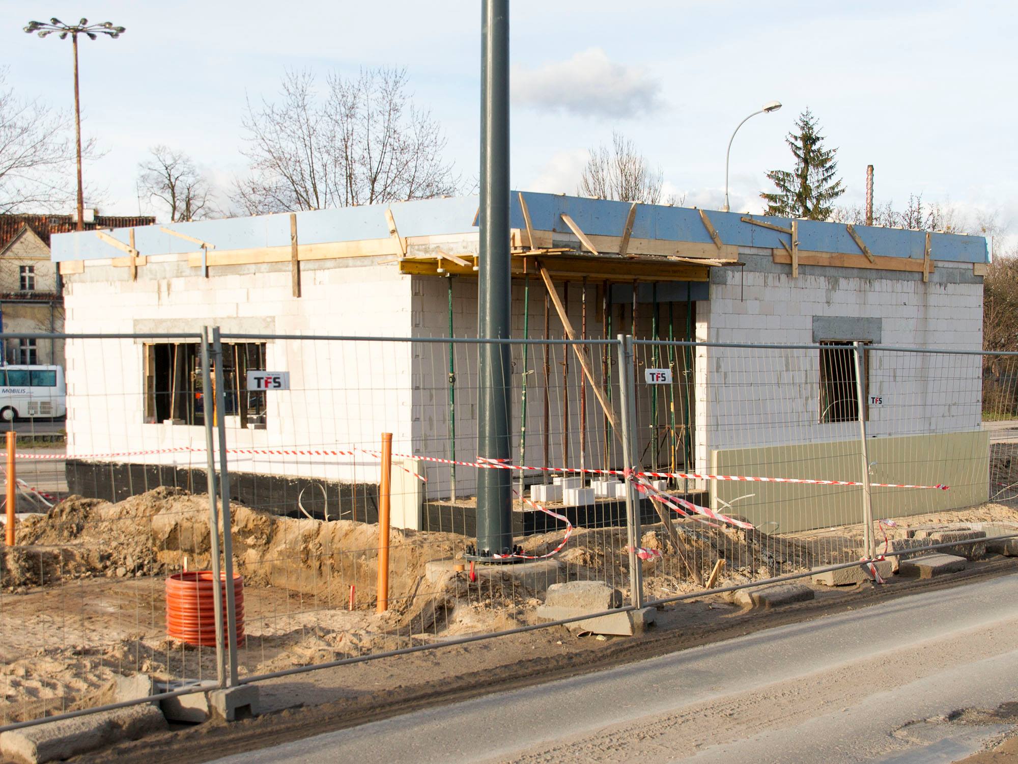Budowa linii tramwajowej na placu Konstytucji 3 Maja (3 kwietnia 2015) – budynek socjalny przy przystanku końcowym Fot. Paweł Bukowski
