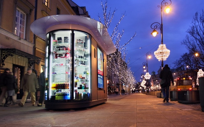 Nowoczesny kiosk na wyremontowanym Krakowskim Przedmieściu