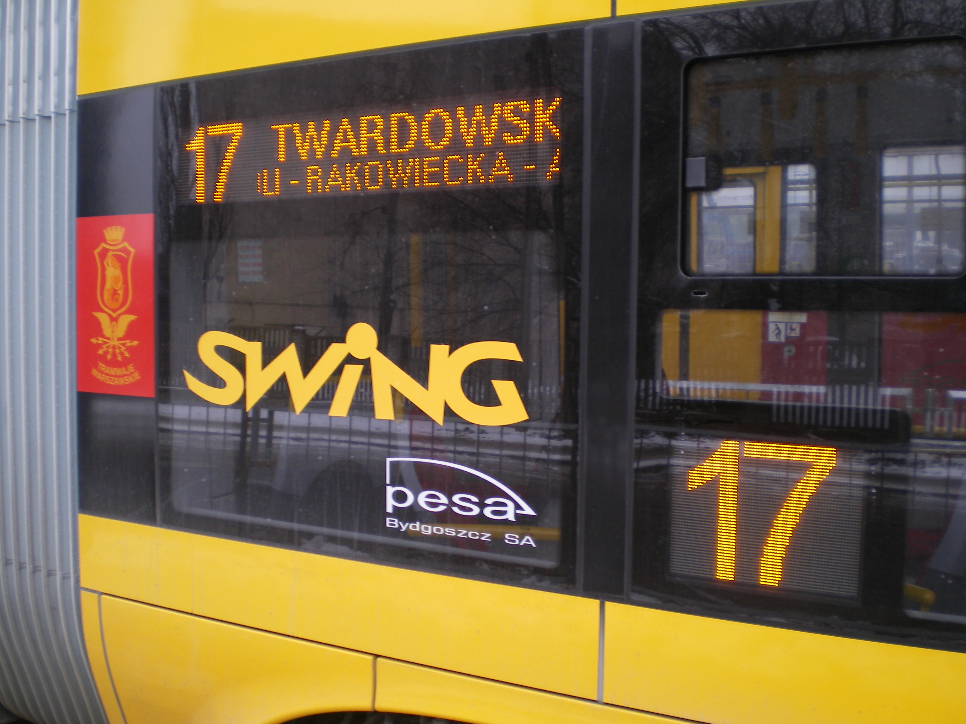 Duży, wyraźny wyświetlacz czołowy Pesy Swing - przy długiej nazwie może ona "przepływać" przez tablicę (warszawska linia 17 kursuje obecnie do pętli Twardowska) © OlsztyńskieTramwaje.pl