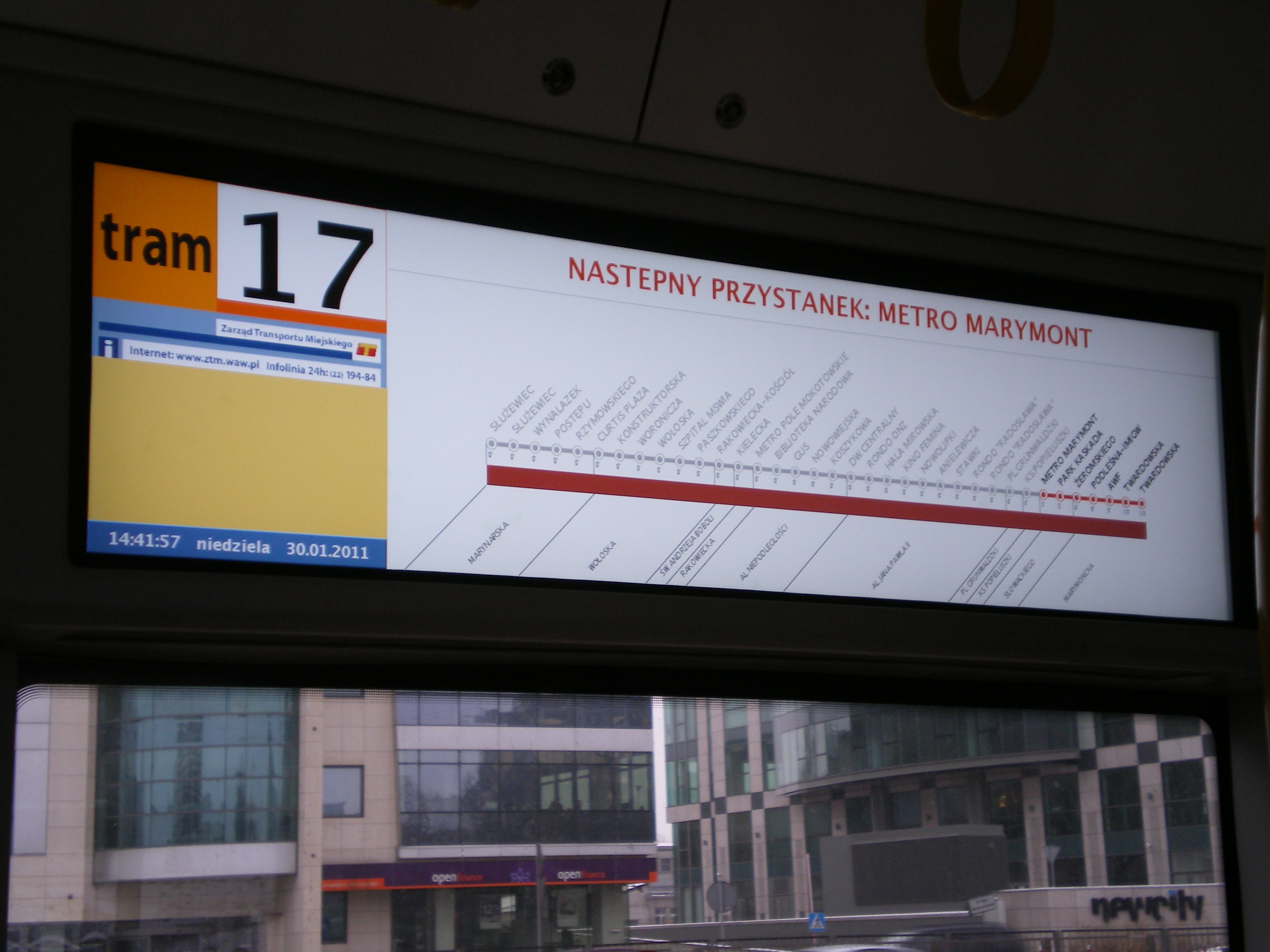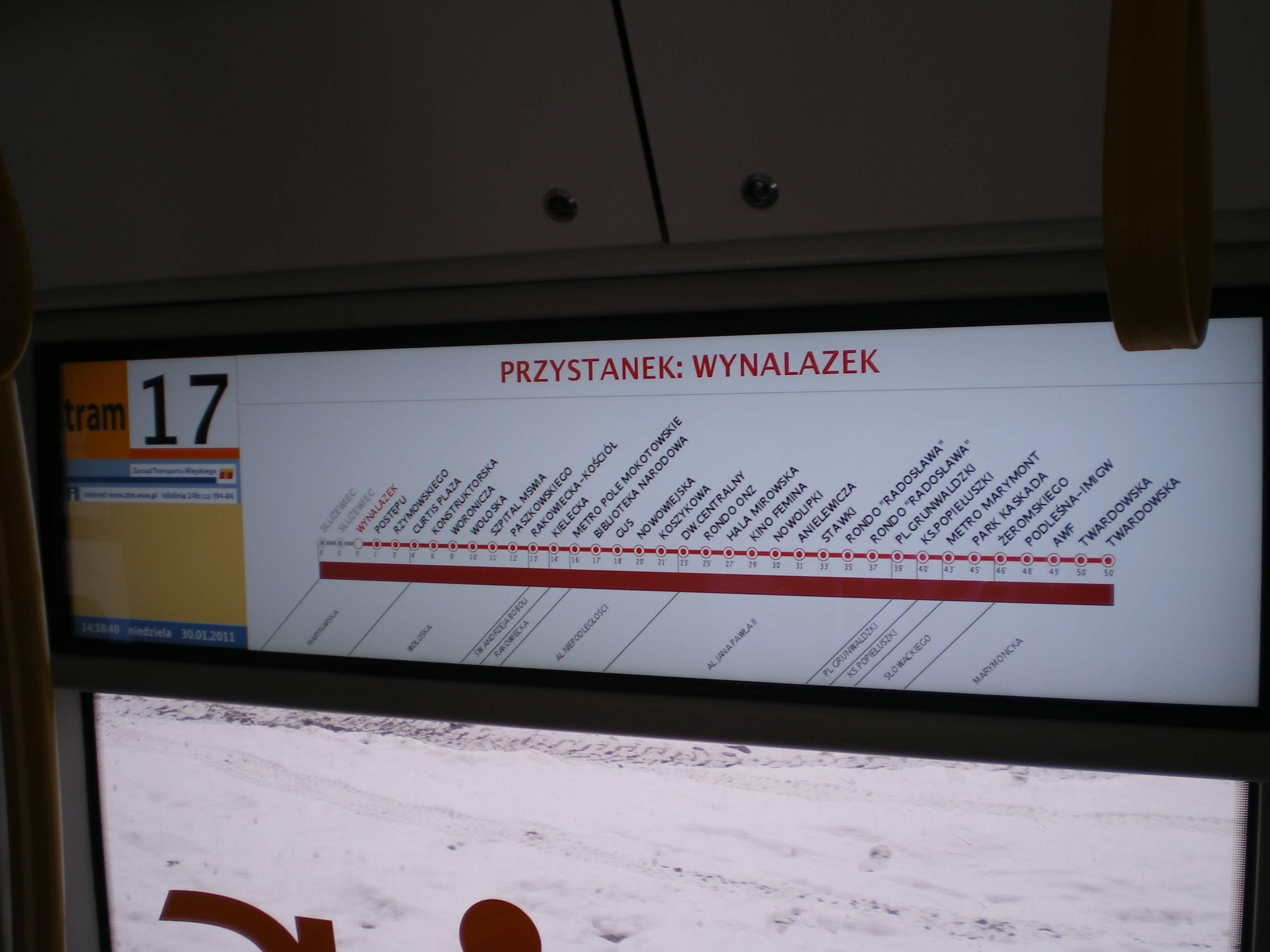 Boczny wyświetlacz należy dobrze wykorzystać – od wewnątrz wagonu powinien być on elektroniczną tablicą kierunkową w formie ekranu ciekłokrystalicznego, wyświetlającą w dynamiczny sposób przebieg trasy (po odjeździe z każdego przystanku zmienia się informacja).