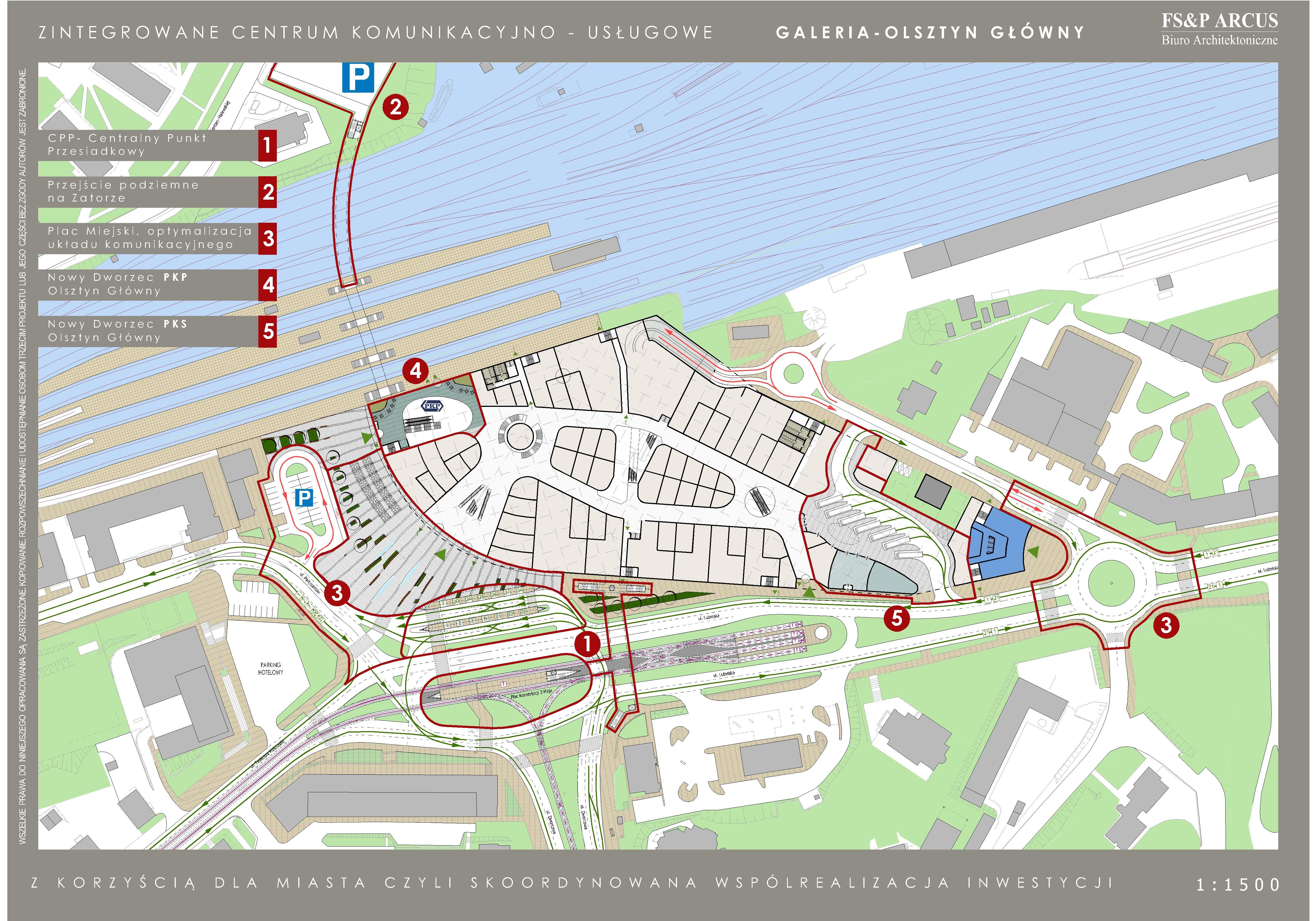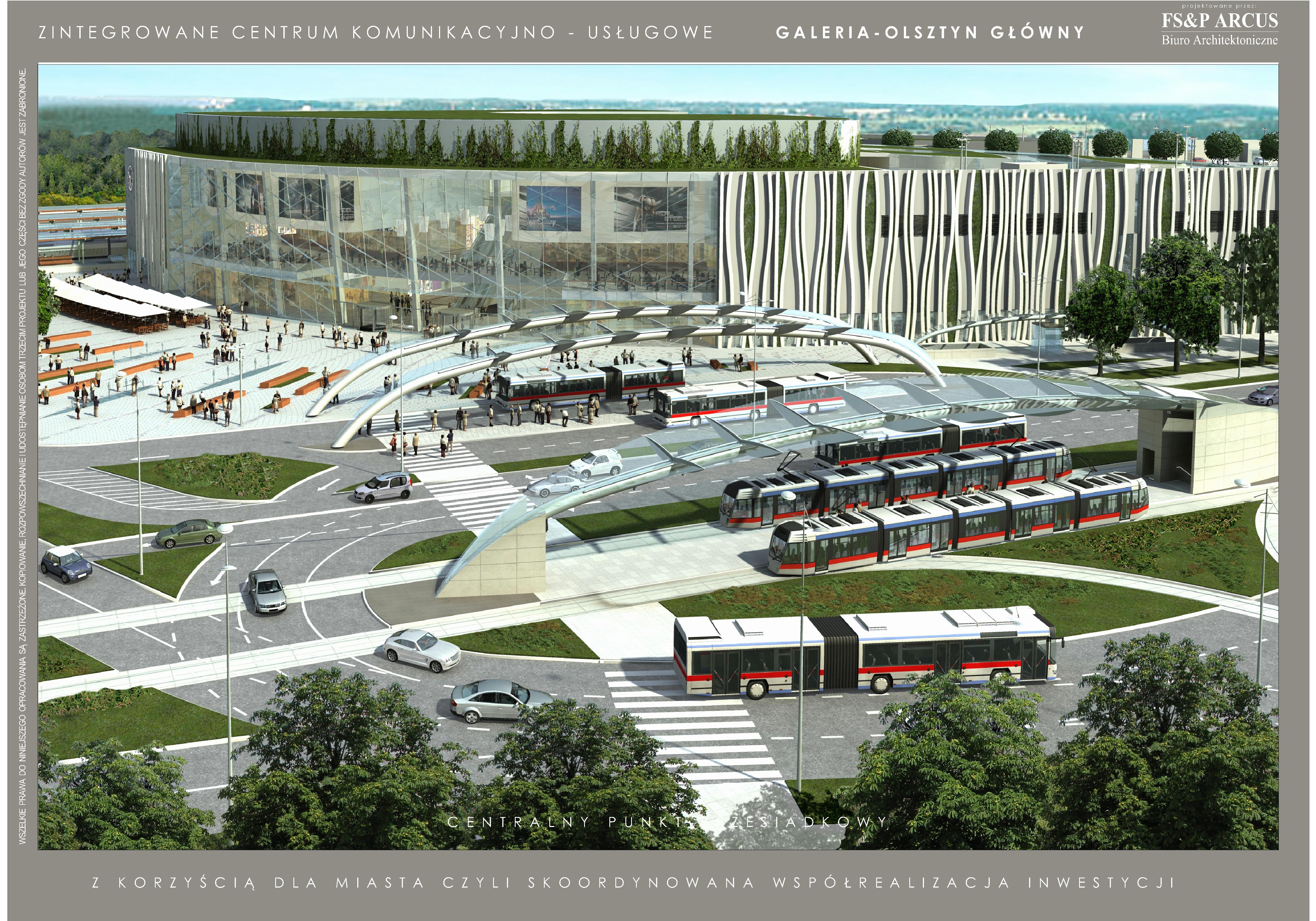 Projektująca na zlecenie Retail Provider przyszłe centrum handlowe i jego otoczenie pracownia FS&P Arcus uwzględniła w swoim projekcie powstającą linię tramwajową i w okolice jej końcowego przystanku zaplanowała przeniesienie także przydworcowych przystanków autobusowych, które dziś znajdują się przy końcu ulicy Partyzantów, między pocztą a dzisiejszym dworcem kolejowym. Po zmianach węzeł komunikacyjny znalazłby się mniej więcej w miejscu wieżowca PKP, który miałby – podobnie jak stary dworzec kolejowo-autobusowy – zostać zburzony. Projektanci widzą końcowy przystanek tramwaju – dwutorowy, z peronem wyspowym – na środku ronda, które tak jak obecnie miałoby kształt elipsy. Tory odstawcze – cztery jak zaplanowano w projekcie linii tramwajowej – miałyby się znaleźć na wschód od przystanku, między jezdniami ulicy Lubelskiej, na wysokości stacji benzynowej Statoil. Dla autobusów zaplanowano dwuperonową pętlę przy rondzie, obok głównego wejścia do centrum handlowego. Plan pozwala stwierdzić, że na każdym z peronów zmieściłyby się po dwa przystanki (przyjmując długość autobusu przegubowego – 18 metrów), czyli pętla liczyłaby w sumie cztery przystanki. Pod węzłem komunikacyjnym pojawiłoby się przejście podziemne: pierwsze wyjście z niego zaplanowane zostało na rogu ulic Dworcowej i Lubelskiej, przy restauracji McDonald`s, drugie prowadziłoby na przystanek tramwajowy, trzecie – na przystanki autobusowe, czwarte – na pierwszy podziemny poziom budynku centrum handlowego. Integralną część centrum stanowiłyby dworzec autobusowy (międzymiastowy) z siedmioma stanowiskami postojowymi oraz hala dworca kolejowego, łącząca się z centrum zarówno na poziomie parteru, jak i podziemia.
