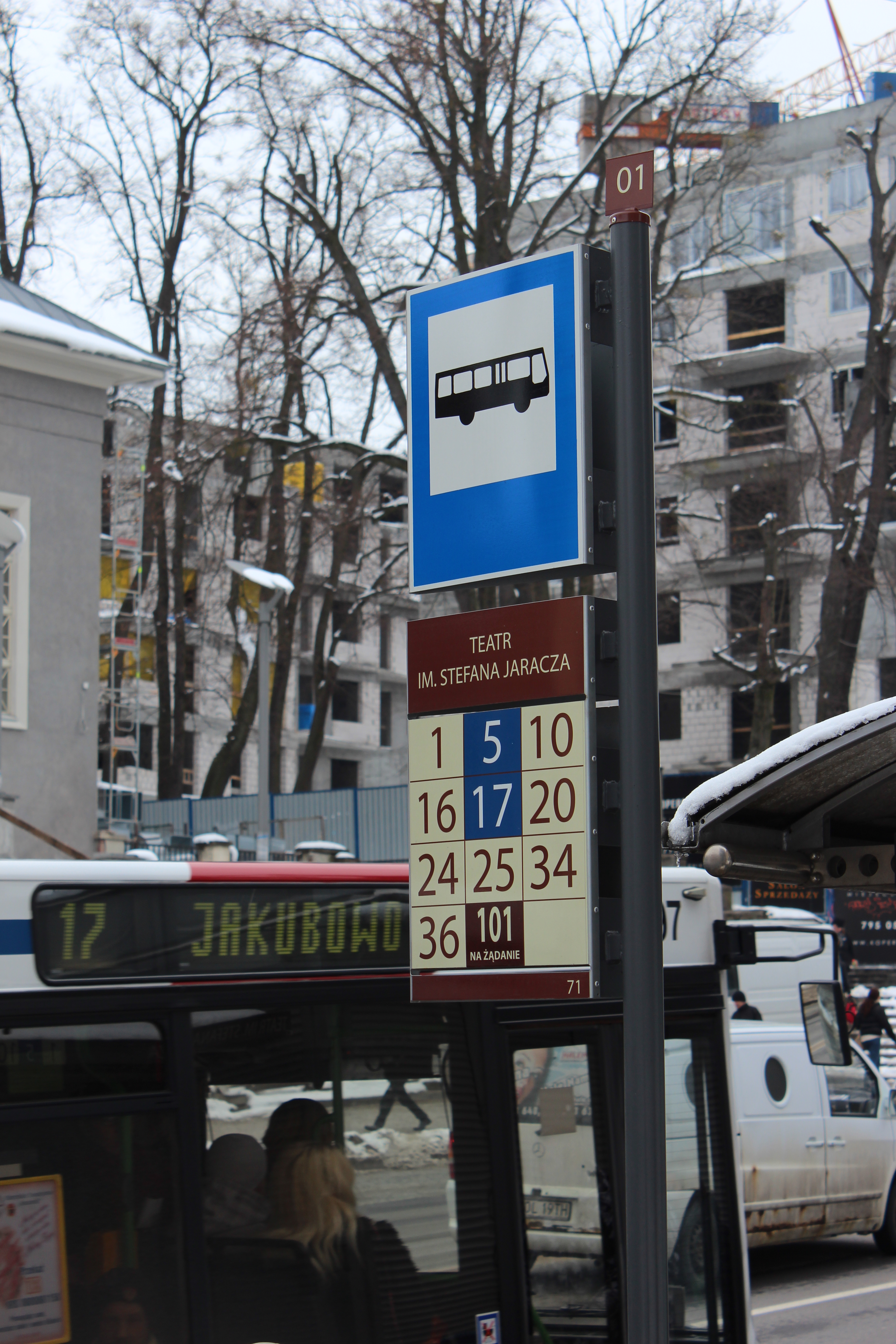 Słupek przystankowy nowego systemu identyfikacji wizualnej Olsztyna (przystanek Teatr im. Stefana Jaracza). W 2017 roku tak mają wyglądać wszystkie przystanki w mieście © OlsztyńskieTramwaje.pl