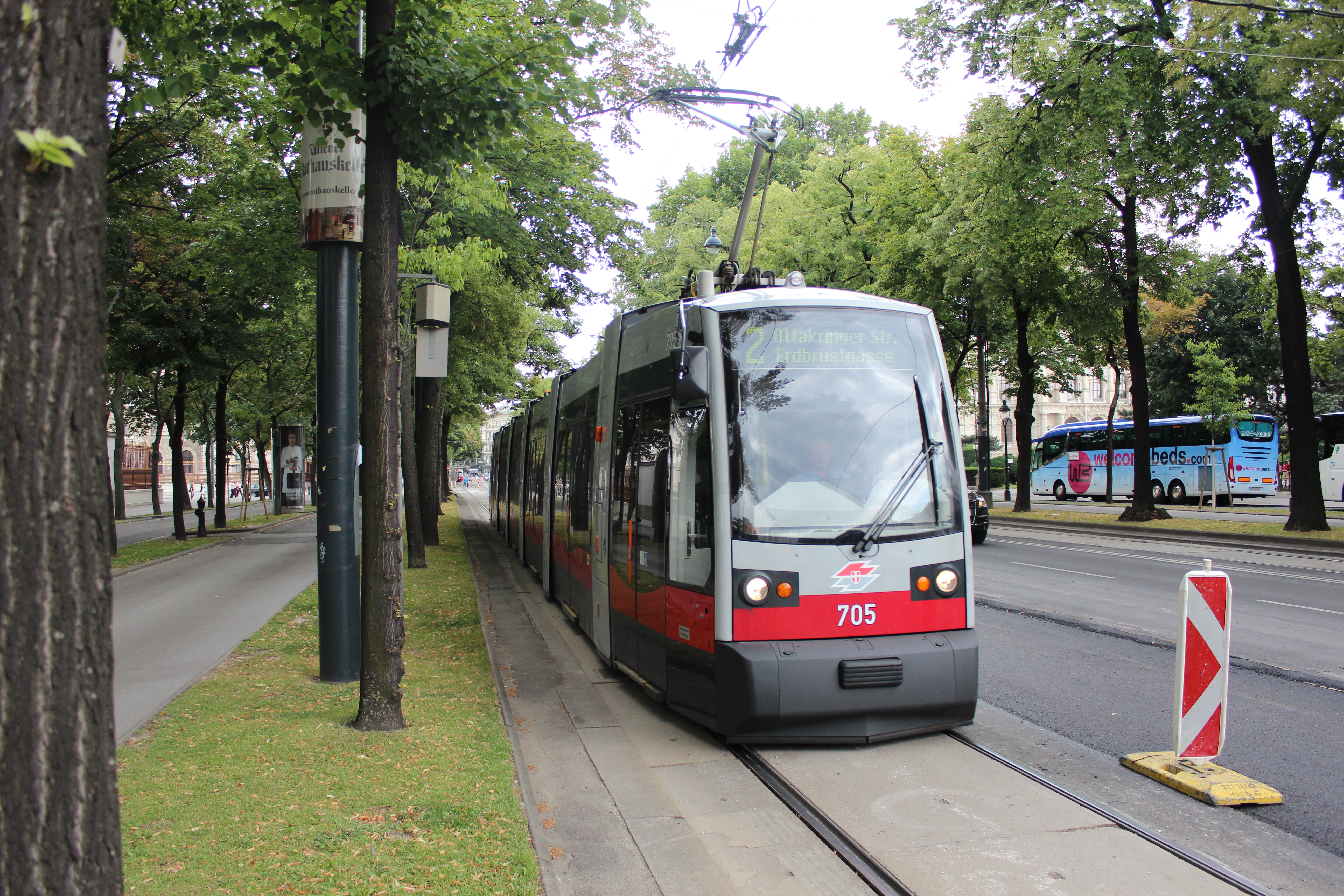 Nikt nie powie, że Wiedeń ma mniejsze problemy z korkami i mniej samochodów niż Olsztyn. A jednak tu śródmiejskie ulice projektuje się dla ludzi i rozumnie. Na widocznym na zdjęciu Ringu (a dokładnie Burgring, którym jedzie tramwaj Siemens ULF – Ultra Low Floor, czyli najbardziej niskopodłogowy na świecie) znalazło się miejsce (od lewej) na chodnik, szpaler drzew, drogę dla rowerów, szpaler drzew, tor tramwajowy, trzy (rozpusta!) pasy dla samochodów, tor tramwajowy w przeciwnym kierunku, szpaler drzew, kolejną drogę dla rowerów, kolejny szpaler drzew, jeszcze jeden chodnik i nawet miejsca parkingowe. Gdyby olsztyńscy planiści wybrali się do Austrii, wiedeńczycy „cieszyliby się” pewnie z jezdni 2×3 albo i 2×4 pasy w każdym kierunku… © OlsztyńskieTramwaje.pl