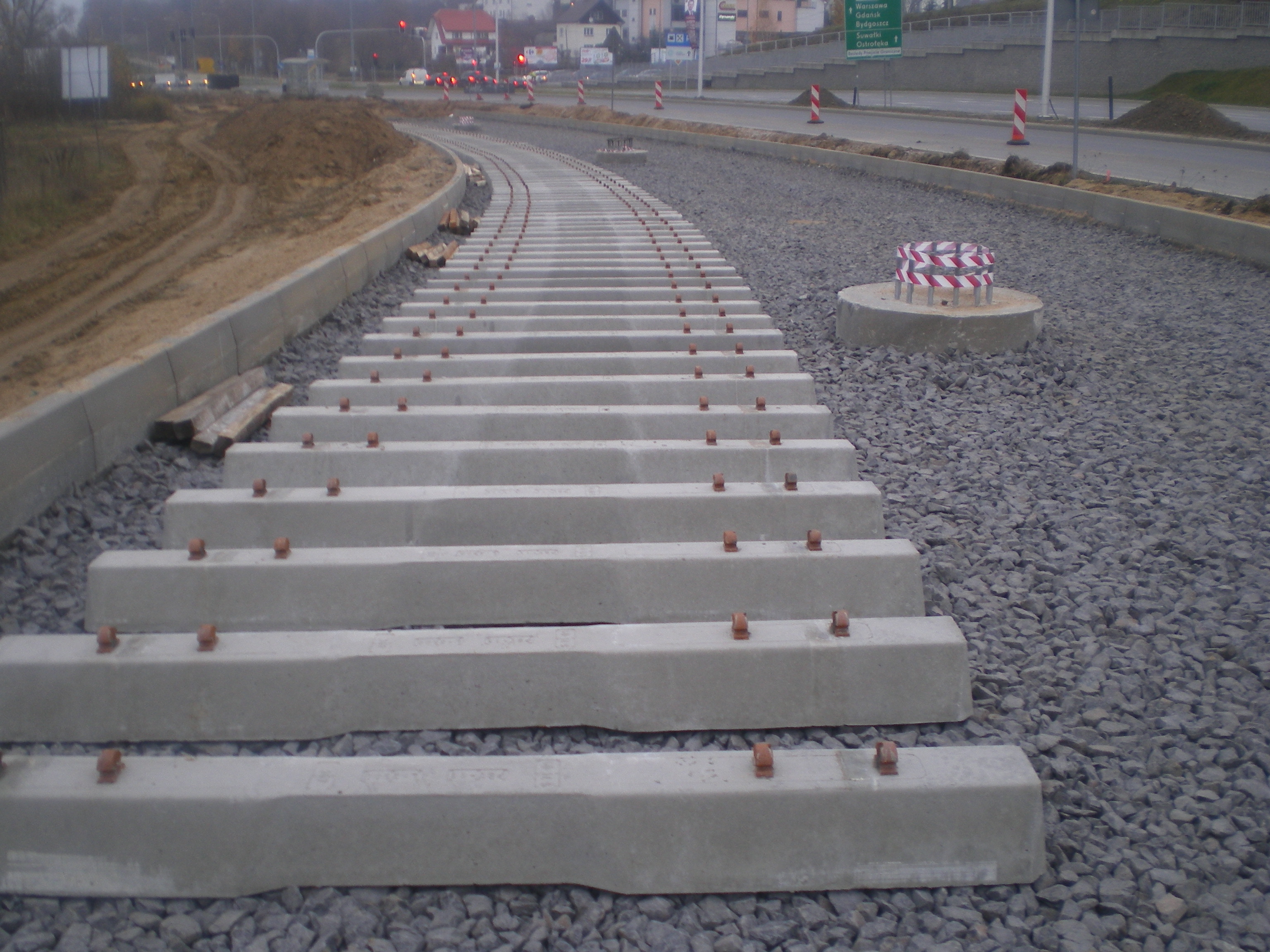 Same szyny wykuwane są w hucie na Śląsku i podobno pierwsza ich partia jest już co najmniej w transporcie. Być może dotarły już na teren zajezdni, gdzie też niedługo powinien zacząć powstawać już układ torowy. Piszemy w trybie przypuszczającym, bo plac budowy zajezdni tramwajowej otacza szczelne blaszane ogrodzenie i podejrzenie czegokolwiek najłatwiejszym zadaniem nie jest. Na szczęście widać to, co nad ziemią i ogrodzeniem, czyli powstającą halę postojową, która jest już na etapie konstrukcji dachu. Wracając jednak do ulicy Płoskiego: jest to najbardziej zaawansowany obecnie plac budowy. Niemal na całej długości ok. 870-metrowego odcinka wzdłuż tej ulicy gotowa jest podbudowa pod torowisko, którego granice są wyznaczone krawężnikami, a między nimi ubity i wyrównany tłuczeń, który właśnie doczekał się pierwszych kilkudziesięciu betonowych podkładów.
