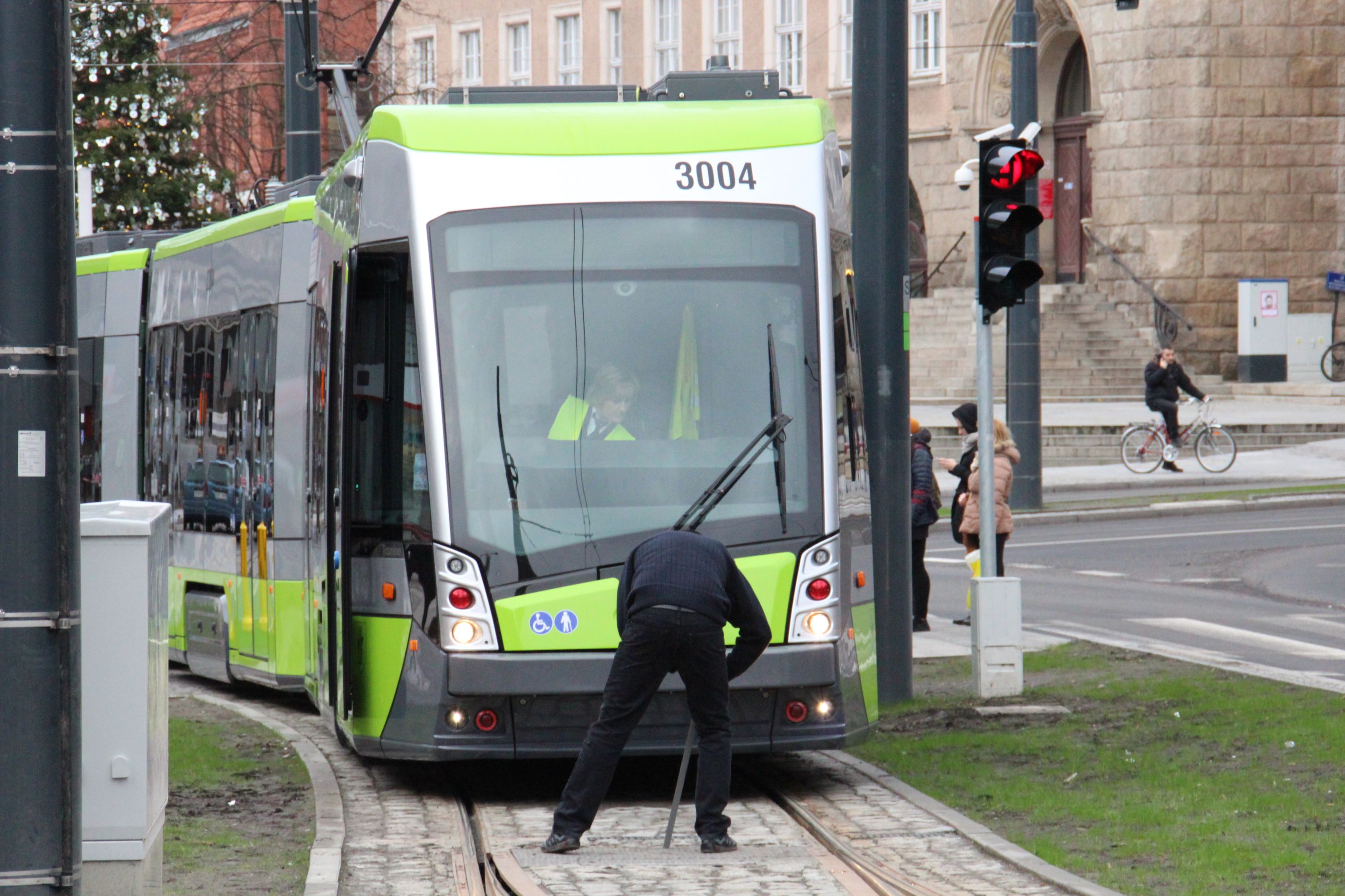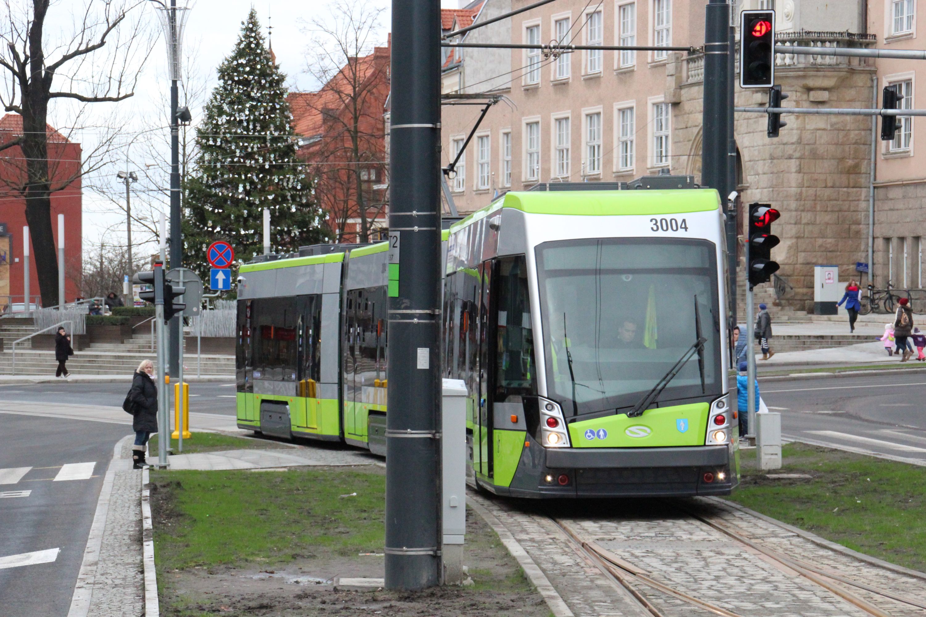 Tramwaj zmienia kierunek jazdy, piesi muszą czekać, bo rozjazd zaplanowano zbyt blisko skrzyżowania. Na zdjęciu: Solaris Tramino Olsztyn S111O #3004 na linii 1 w alei Piłsudskiego (23 grudnia 2015) © OlsztyńskieTramwaje.pl