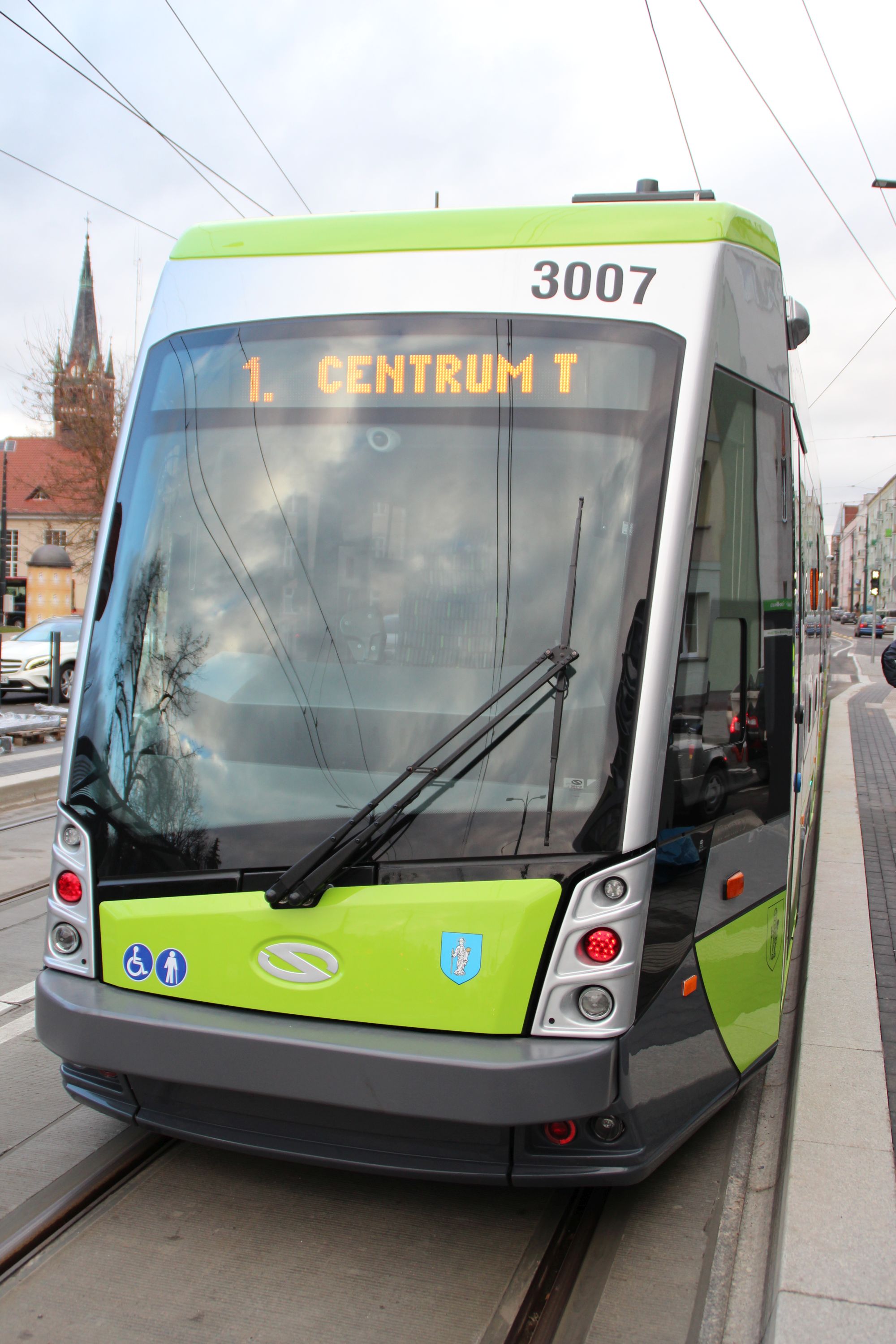 Solaris Tramino Olsztyn S111O #3007 na linii 1 na przystanku Skwer Wakara (23 grudnia 2015), w tle wieża kościoła pw. Najświętszego Serca Pana Jezusa © OlsztyńskieTramwaje.pl