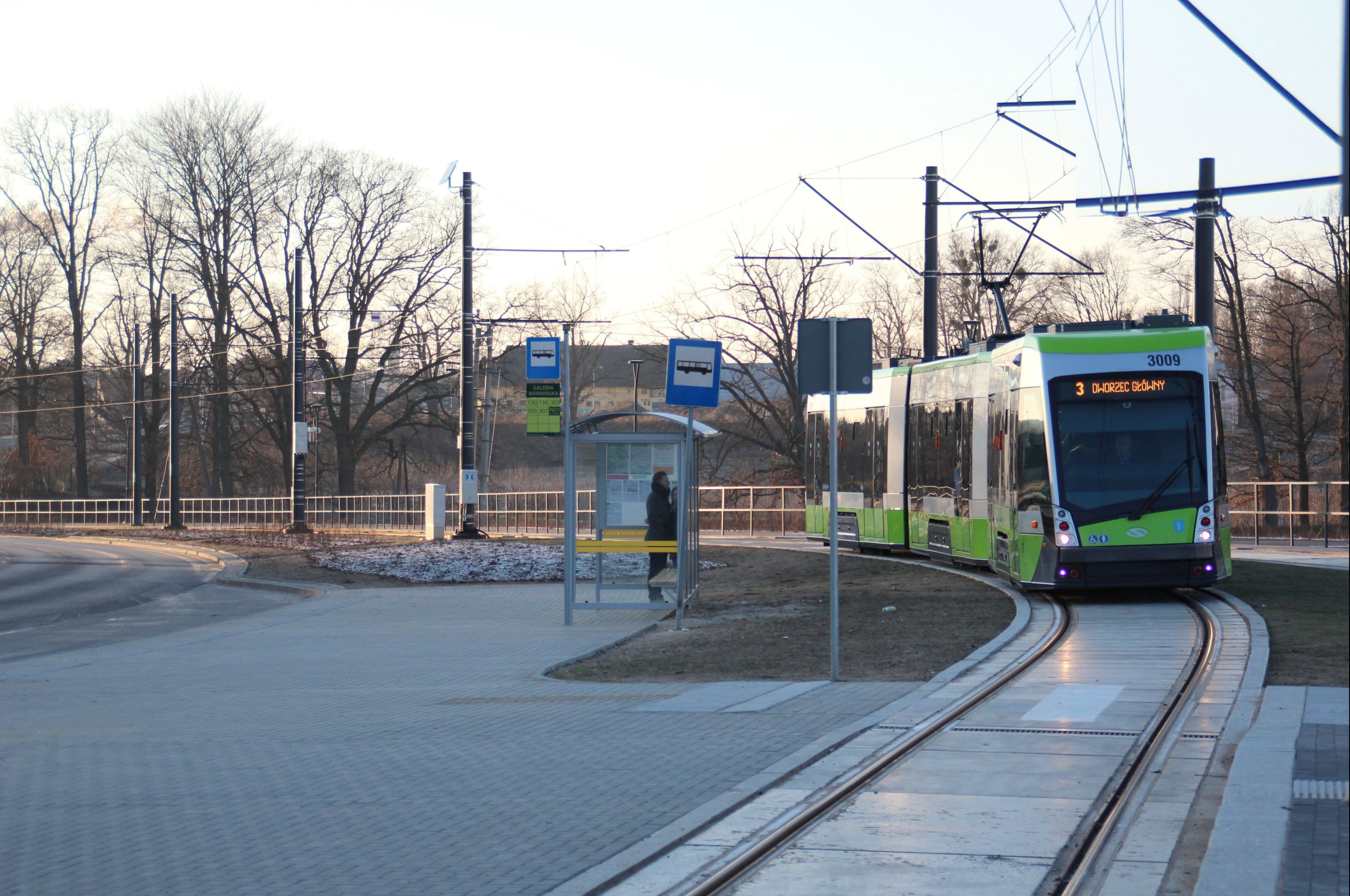 Solaris Tramino Olsztyn S111O #3001 na linii 2 w pierwszym dniu jej kursowania (27 grudnia 2015) na przystanku początkowym Dworzec Główny © OlsztyńskieTramwaje.pl
