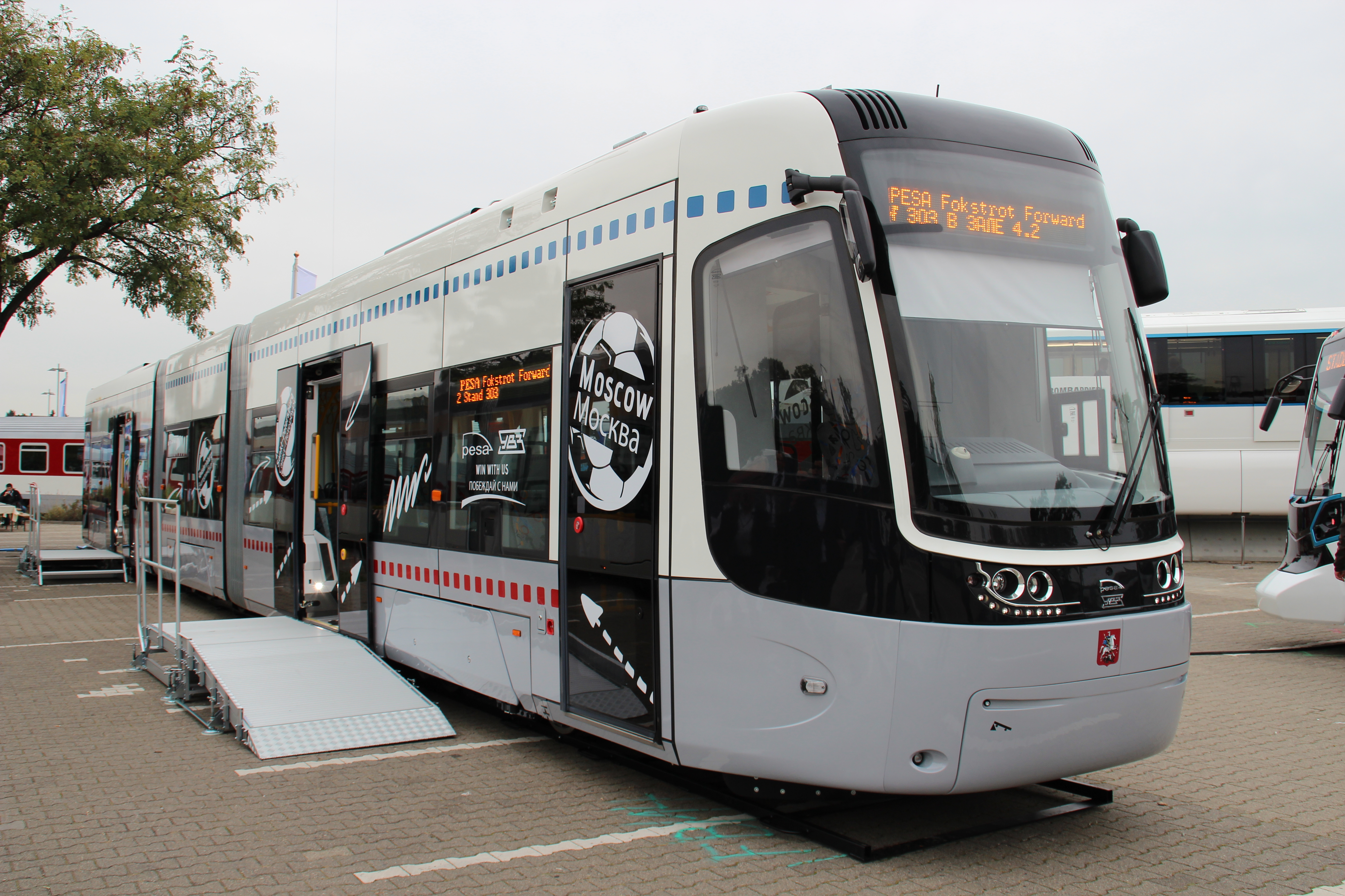 Polska Pesa pokazała w Berlinie aż dwa tramwaje – oba wówczas niemal prosto z linii produkcyjnej. Pierwszym był kolejny wóz z „muzycznej” serii – model Fokstrot wyprodukowany dla Moskwy. Wspólnie z rosyjskim partnerem – firmą UWZ producent z Bydgoszczy zdobył zamówienie na aż 120 tramwajów dla moskiewskiego operatora GUP Mosgortrans. Kontrakt udało się podpisać w maju 2013 roku, a już od czerwca 2014 roku pierwsze Fokstroty zaczęły pojawiać się na ulicach stolicy Rosji. Jeszcze w czasie trwania targów InnoTrans wszystko wyglądało świetnie, ale na początku 2015 roku zaczęły się kłopoty. Fatalna sytuacja rosyjskiej gospodarki i pikujący kurs rubla wobec euro sprawiły, że Fokstroty stały się dla ich kupca za drogie i po odebraniu połowy z zamówionych tramwajów po prostu stwierdził, że nie da rady zapłacić za kolejne. Pesa solidnie produkowała tramwaje dalej, licząc, że GUP Mosgortrans jednak ostatecznie wywiąże się z umowy. Po półtora roku sytuacja wygląda tak, że 60 Fokstrotów czeka w fabryce Pesy, a negocjacje z Rosjanami trwają. W maju 2016 roku pojawiły się informacje, że bydgoskiej firmie uda się jednak wyeksportować choć 30 z 60 tramwajów czekających na wyjazd do Moskwy, ale od tego czasu w tej sprawie cisza. Pesie, która po ubiegłorocznych opóźnieniach z dostawami pojazdów ma na karku spore kary umowne, bardzo by się pieniądze z Moskwy przydały. Niestety, na razie nic się nie zmieniło.