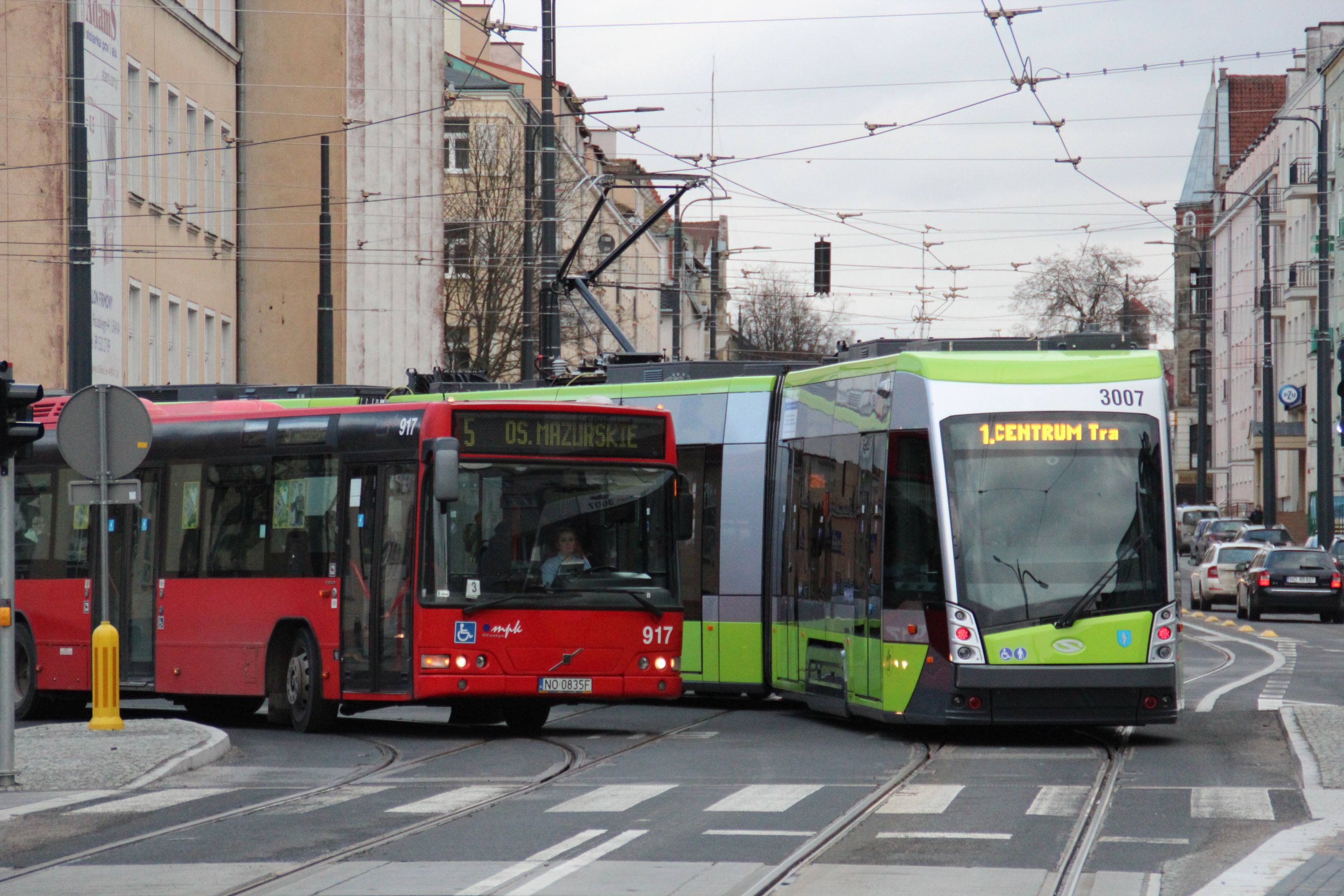 Autobus czy tramwaj? Większość pasażerów, jeśli ma wybór, zdecyduje się na tę drugą opcję. Na zdjęciu: Volvo B7L V7000 #917 na linii 5 i Solaris Tramino Olsztyn S111O #3007 mijają się na skrzyżowaniu alei Piłsudskiego i ulicy Kościuszki (23 grudnia 2015) © OlsztyńskieTramwaje.pl
