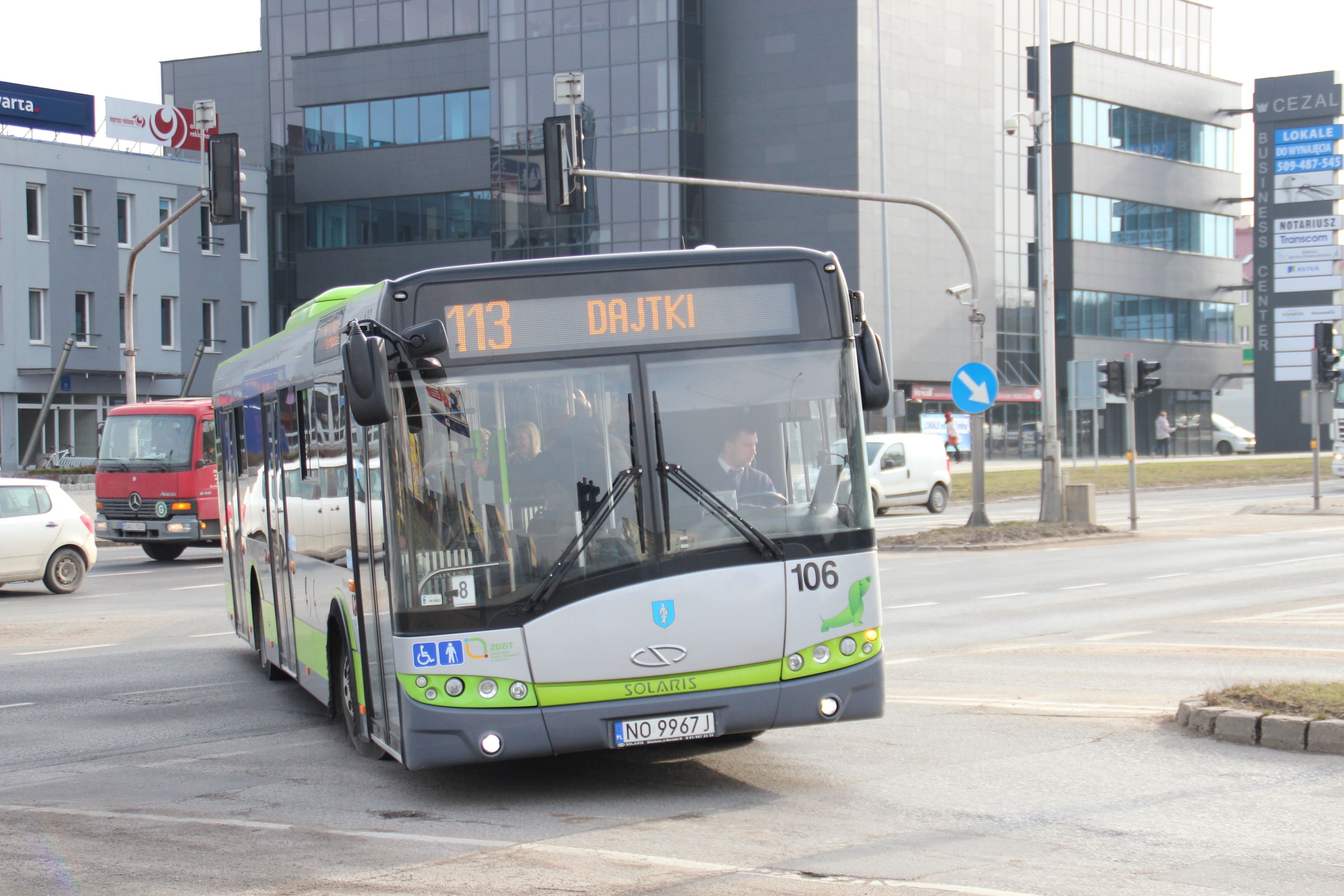 Solaris Urbino 12 III #106 na linii 113 skręca z ulicy Wyszyńskiego w aleję Piłsudskiego (29 lutego 2016) – po wybudowaniu tu linii tramwajowej wjedzie już na wspólny pas autobusowo-tramwajowy poprowadzony środkiem jezdni, po torowisku © OlsztyńskieTramwaje.pl