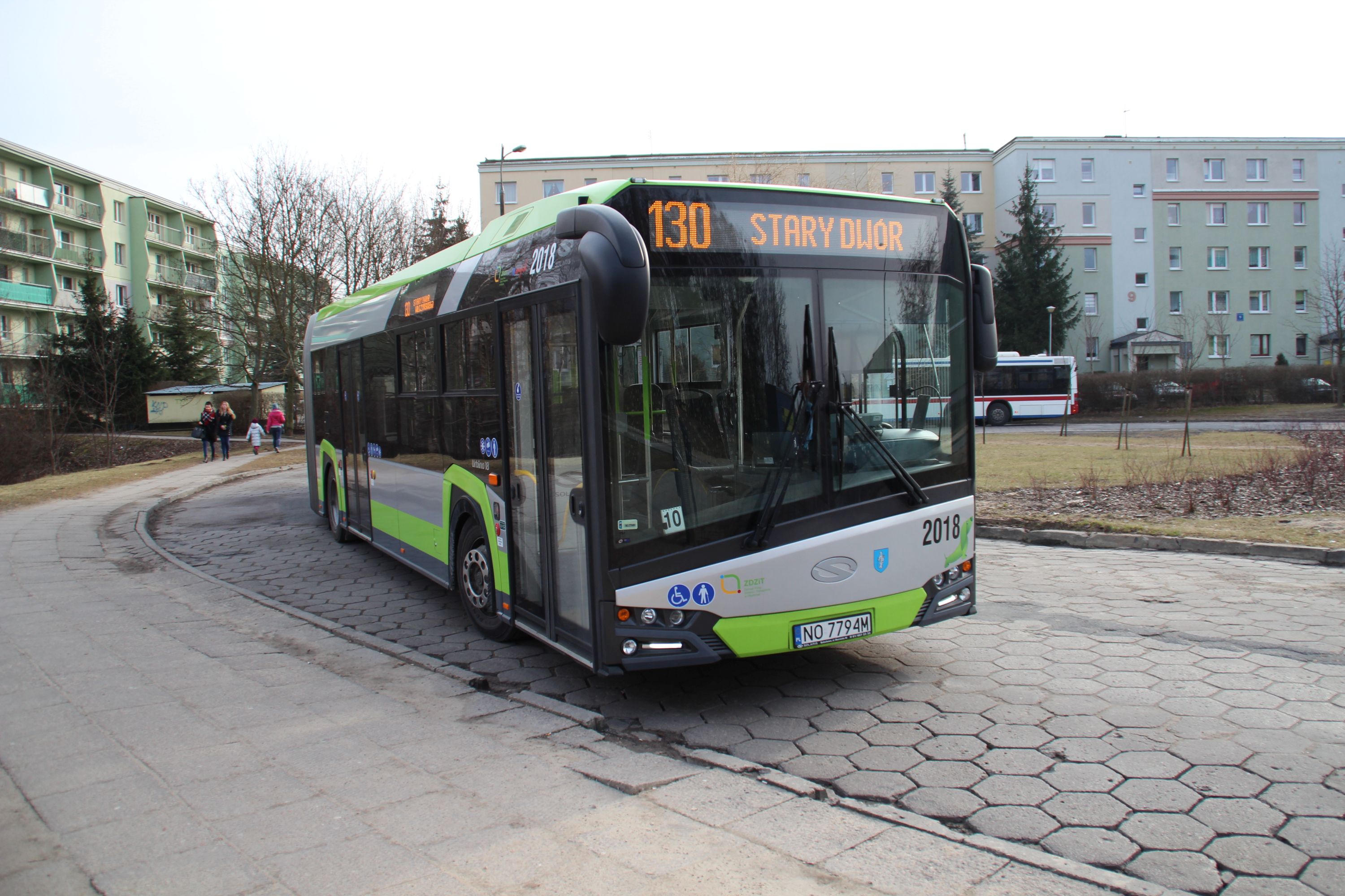 Solaris Urbino 18 IV #2018 na linii 130 na pętli Pieczewo (29 lutego 2016) – po wybudowaniu linii tramwajowej zniknie tu tradycyjna pętla „łezka” wyłożona trylinką, a pojawi się rozbudowany węzeł komunikacji miejskiej © OlsztyńskieTramwaje.pl