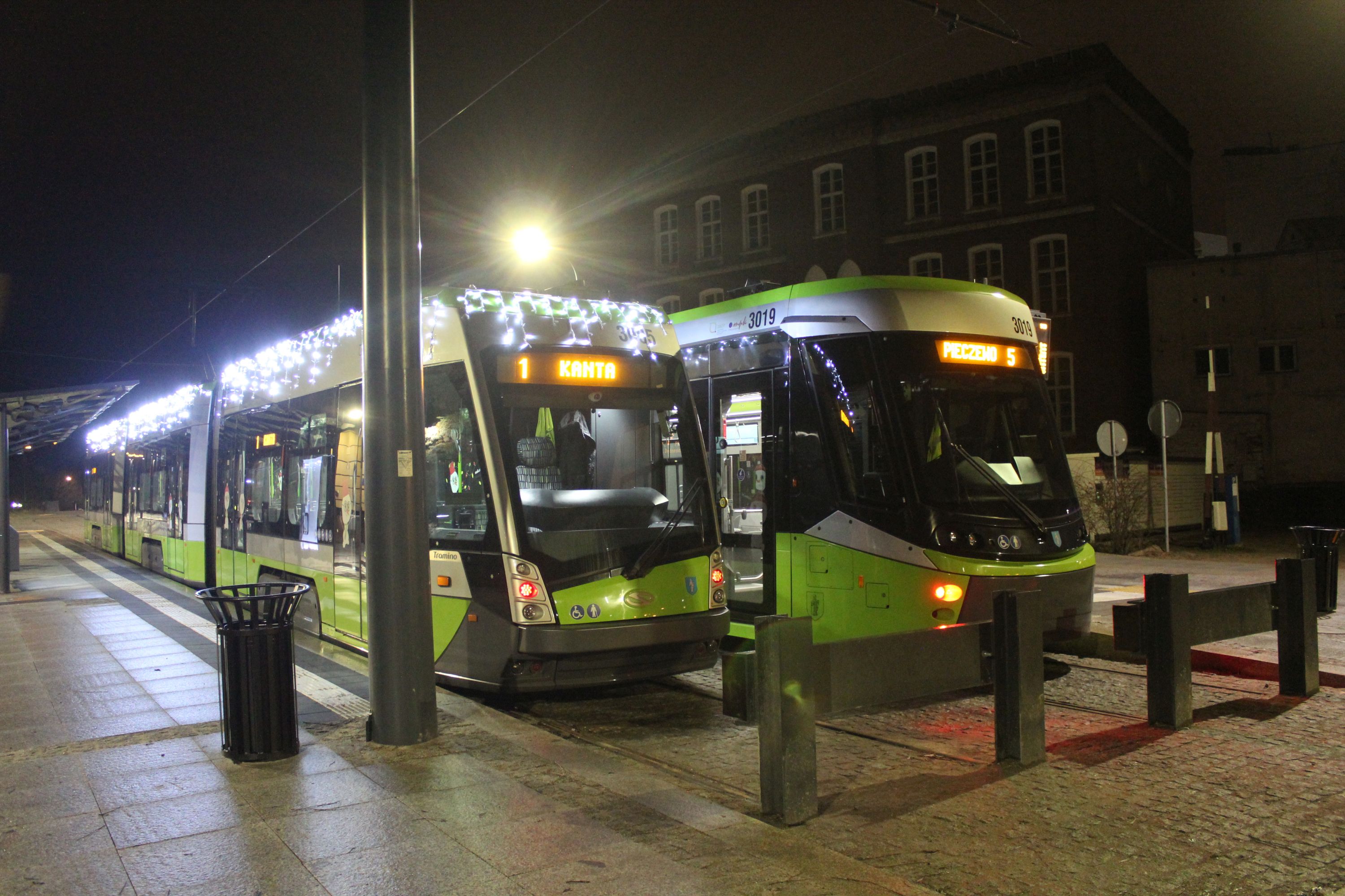 Solaris Tramino Olsztyn S111O #3005 ze świątecznymi dekoracjami na linii 1 i Durmazlar Panorama Olsztyn DRP5H05 #3019 na przystanku początkowym Wysoka Brama przed rozpoczęciem pierwszego kursu linii 5 w kierunku Pieczewa w pierwszym dniu jej kursowania (1 stycznia 2024) © OlsztyńskieTramwaje.pl