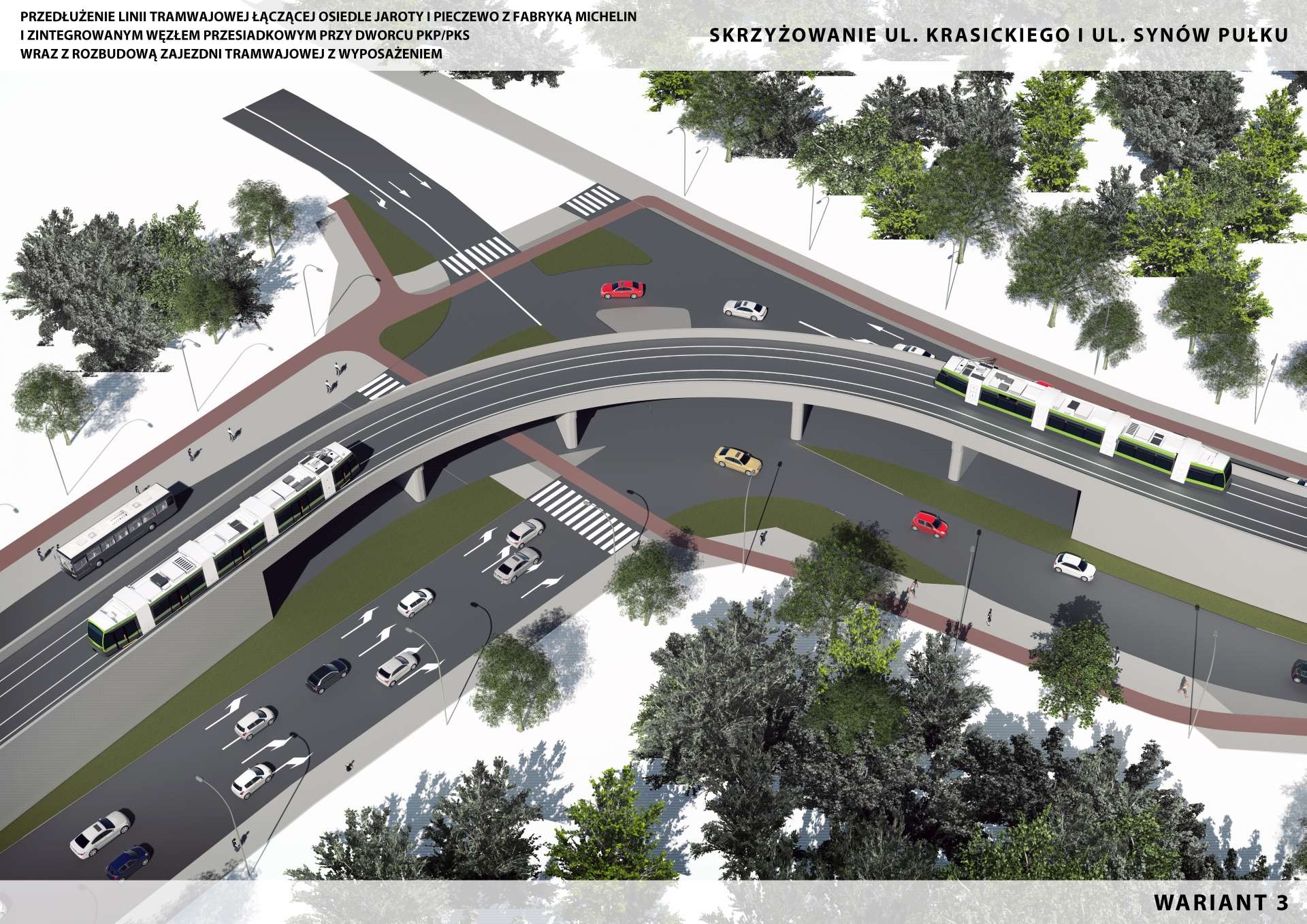 Projektanci przygotowali – jak w przypadku całej trasy – trzy warianty przebiegu torowiska. W pierwszym tramwaj jechałby po zachodniej stronie ulicy Krasickiego, po stronie Nagórek, w pozostałych dwóch tory znalazłyby się w pasie zieleni między jezdniami. Tak jak na Wilczyńskiego opcja z torowiskiem przy jezdni oznacza kosmetyczne zmiany w przebiegu ulicy, w pozostałych dwóch konieczne byłyby większe korekty. Dwa warianty „jezdniowe” różnią się przede wszystkim rozwiązaniami inżynieryjnymi – jeden to klasyczne torowisko w poziomie drogi, drugi przewiduje dwie estakady dla zniwelowania różnicy poziomów trasy. Pierwsza z nich – patrząc od południa – miałaby znaleźć się nad skrzyżowaniem ulic Krasickiego i Barcza. Na niej umieszczony miałby być przystanek tramwajowy w obu kierunkach. Pasażerowie mogliby się na niego dostać schodami lub windami. To oczywiście obniża jego dostępność, bo z polskiego doświadczenia wiemy, że windy w najlepszym przypadku zamieniają się w publiczne toalety, a najgorszym – i wcale nie tak rzadkim – przestając działać na tygodnie lub miesiące. Osoba starsza, niepełnosprawna czy rodzic z dzieckiem mogą w takim wypadku udać się na „najbliższy czynny taras widokowy we Wrocławiu”, czyli w tym przypadku na przystanki przy Jeziołowicza lub Wańkowicza. Hipotetycznie, bo w większości przypadków oznacza to rezygnację z podróży. Zdecydowanie lepszym rozwiązaniem są w takim przypadku pochylnie, ale planiści w projekcie nie znaleźli na nie miejsca. Druga estakada miałaby pozwolić na bezkolizyjne ominięcie skrzyżowania ulic Krasickiego i Synów Pułku. Miałaby się zaczynać za skrzyżowaniem ulic Krasickiego i Murzynowskiego, przy którym powstałby nowy przystanek, i kończyć się na Synów Pułku, na wysokości drogi dojazdowej do ogrodów działkowych „Dolinka”. Pomysł chwalebny, bo początek i koniec estakady znajdowałyby się na podobnym poziomie i pozwoliłaby ona uniknąć zjazdu do skrzyżowania Krasickiego z Synów Pułku, a następnie podjazdu. Tyle że… wystarczyłoby nie trzymać się drogi i ułożyć torowisko na skarpie bliżej domów Osiedla Mazurskiego i kwestia różnicy poziomów nam znika bez umajenia krajobrazu betonową kolumnadą.