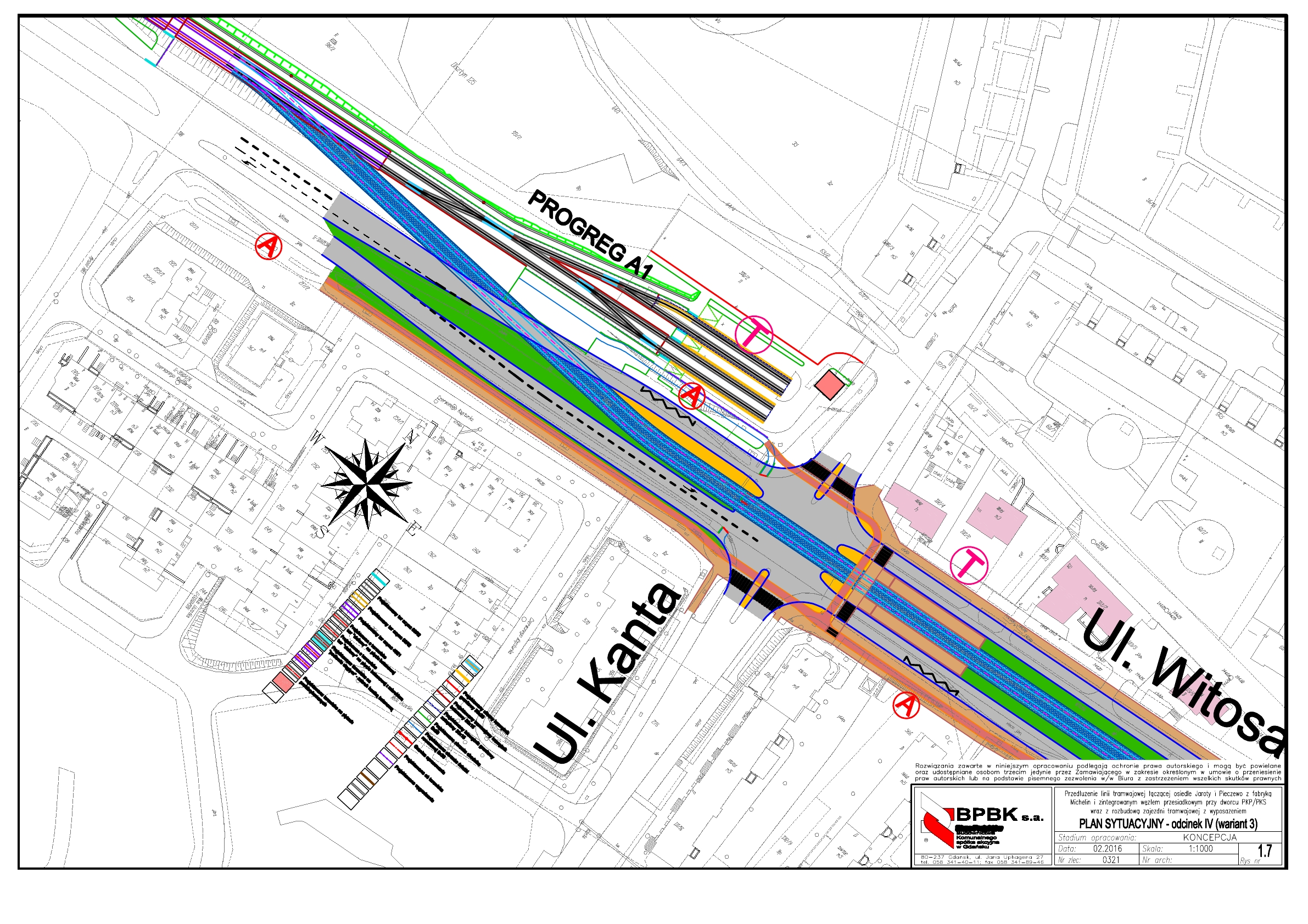 Jeśli chodzi o lokalizację torowiska, to w przypadku ulicy Dworcowej nie budzi ona kontrowersji – tu akurat chyba wszyscy zgadzają się, że najlepszym rozwiązaniem są tory w pasie zieleni między jezdniami. Jest on wystarczająco szeroki, gęstość zaludnienia po obu stronach ulicy jest równomierna, a najstarsze odcinki ulicy, gdzie zachowano tradycyjny układ pierzejowy (na osiedlu Pojezierze – między placem Ofiar Katynia a parkiem Kusocińskiego) zamiast modernistycznych dzikich pól, powodują, że jest to opcja najmniej uciążliwa dla mieszkańców. Ulicą Żołnierską między Wyszyńskiego a Dworcową tramwaj – według projektu przygotowanego przez BPBK po pierwszych spotkaniach konsultacyjnych – miałby jechać obok jezdni, po jej południowej stronie (tam, gdzie Szkoła Podstawowa nr 22). To także rozwiązanie słuszne – Żołnierska wciąż jest ulicą z ruchem więcej niż lokalnym, więc nie ma sensu niepotrzebnie mieszać ruchu tramwajowego z samochodowym. Tramwajowi separacja od aut na pewno posłuży. Podobnego argumentu należałoby użyć, gdyby tramwaj pojechał jednak aleją Piłsudskiego od Wyszyńskiego do placu Inwalidów Wojennych. Tu także ewentualne umieszczenie torowiska w jezdni, co przewidują dwa z trzech projektów, może być uzasadnione głównie chęcią wyciągnięcia na remont tejże jezdni pieniędzy z funduszy na transport publiczny. Opcja z torowiskiem obok ulicy zakłada jego ułożenie po stronie północnej, czyli tam, gdzie stadion, pływalnia, park, ale nie tam, gdzie większość pasażerów. Po południowej stronie znajduje się ogromny kwartał zabudowy – jego mieszkańcy mogliby wsiadać i wysiadać z tramwaju, nie oglądając się na to, czy jadą samochody, czy nie, ale grupa projektantów z Gdańska postanowiła im tę możliwość odebrać w imię… no właśnie: w imię czego? Miejmy nadzieję, że jeszcze zostanie to zmienione.