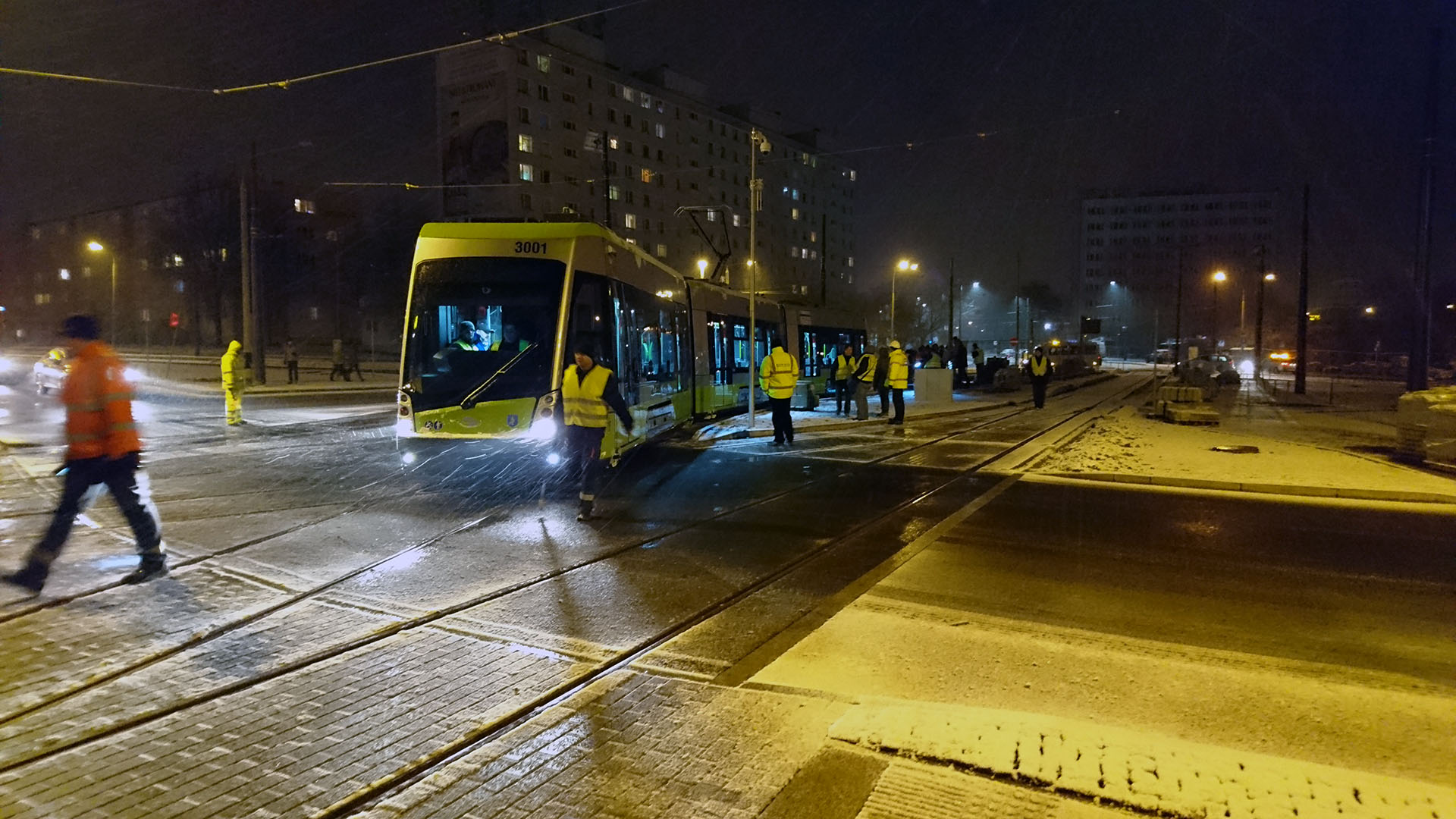 Solaris Tramino Olsztyn S111O #3001 na przystanku końcowym Dworzec Główny podczas trzeciego przejazdu próbnego (23 listopada 2015) Fot. Paweł Bukowski