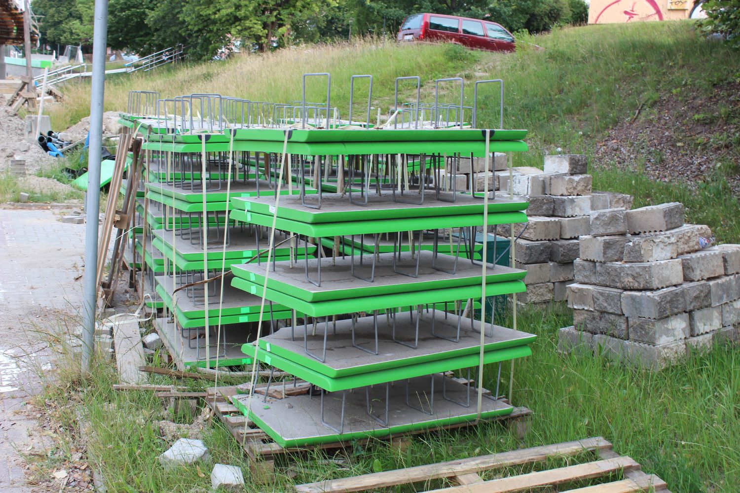 Budowa estakady tramwajowej w ulicy Krasickiego – płyty elewacyjne estakady (5 lipca 2023) © OlsztyńskieTramwaje.pl