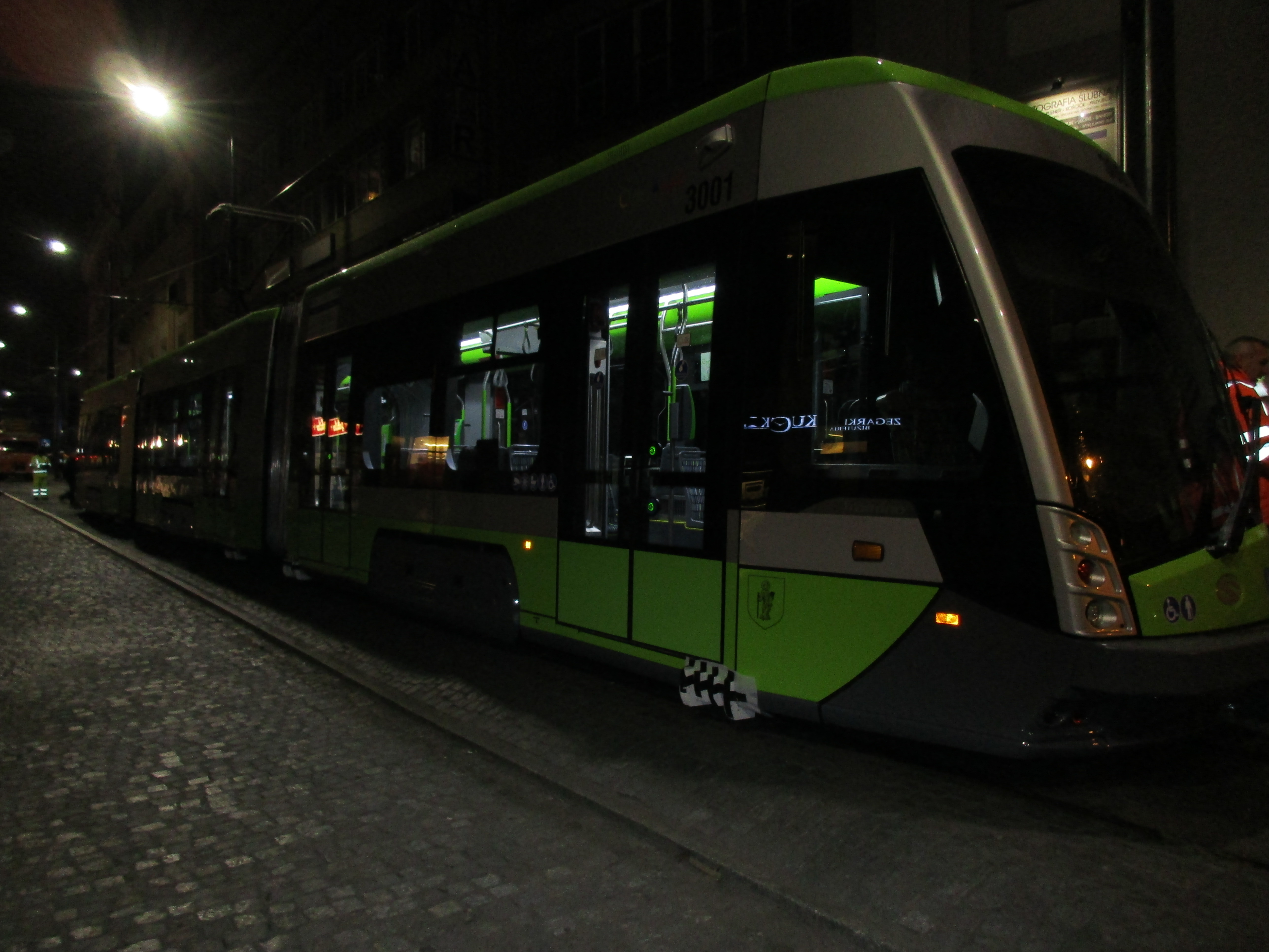 Solaris Tramino Olsztyn S111O #3001 na przystanku końcowym Wysoka Brama podczas drugiego przejazdu próbnego (20 listopada 2015) © OlsztyńskieTramwaje.pl