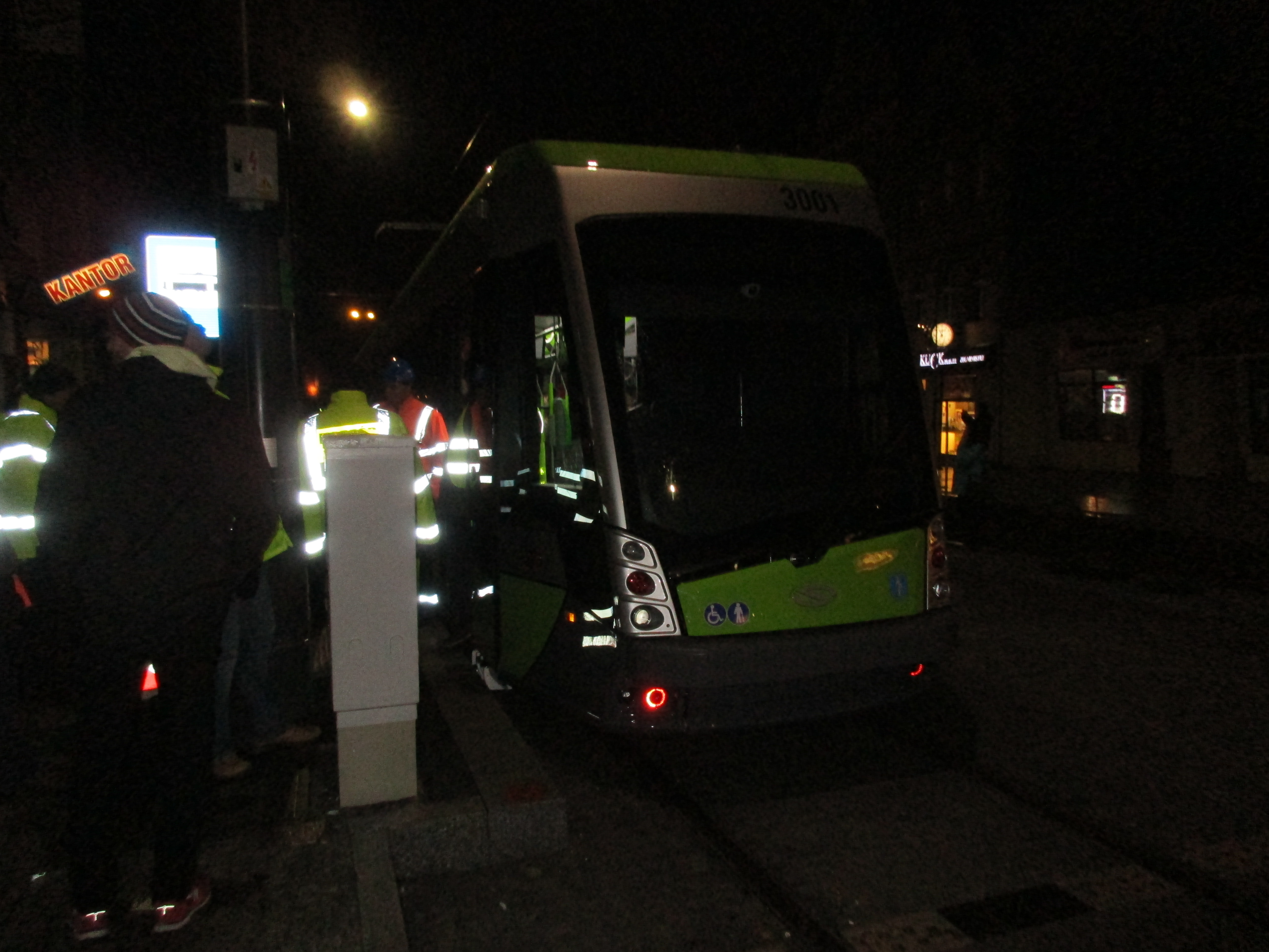 Solaris Tramino Olsztyn S111O #3001 na przystanku końcowym Wysoka Brama podczas drugiego przejazdu próbnego (20 listopada 2015) © OlsztyńskieTramwaje.pl