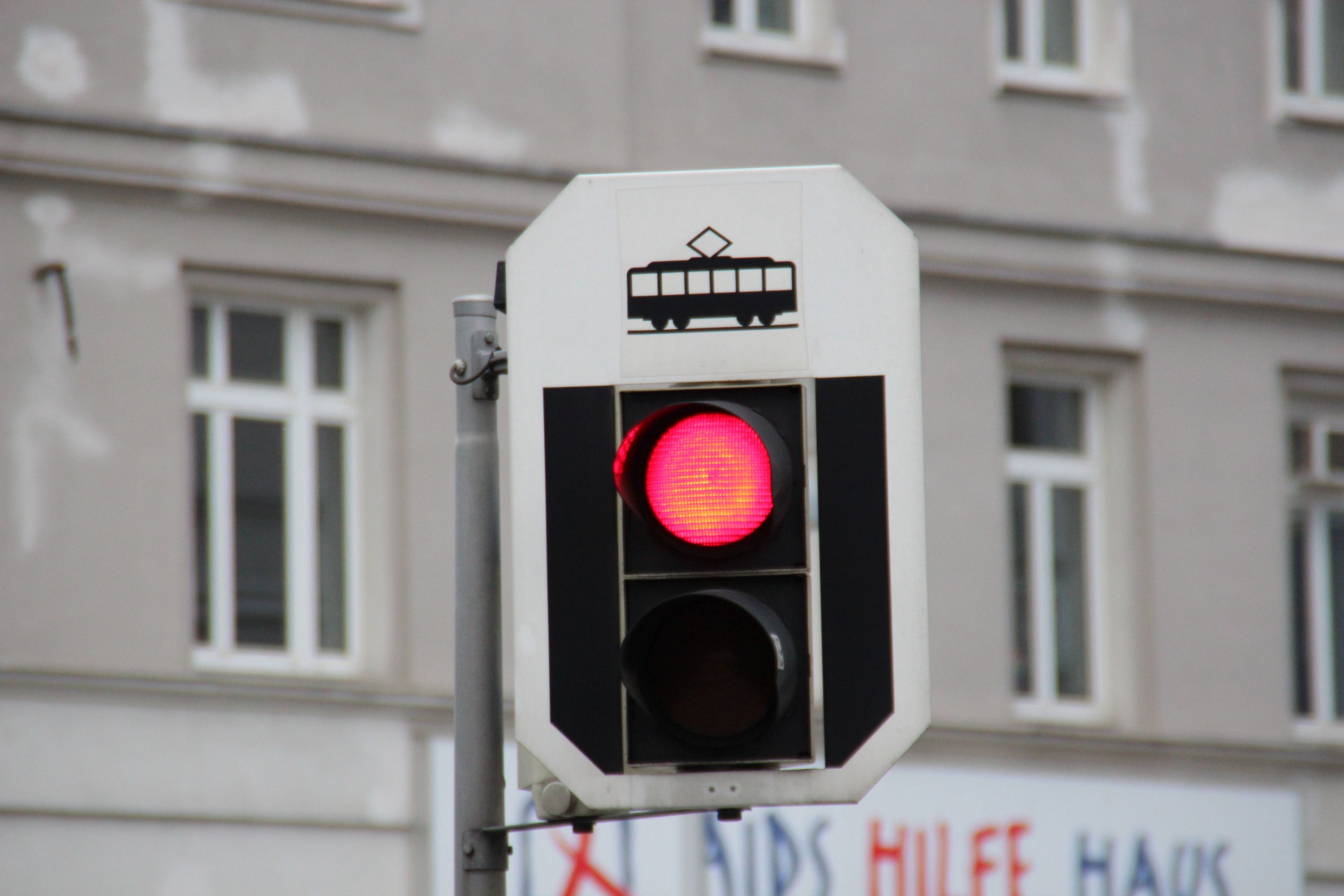 Sygnalizator ostrzegawczy na przejściu przez torowisko (światło czerwone stałe podczas przejazdu tramwaju) © OlsztyńskieTramwaje.pl