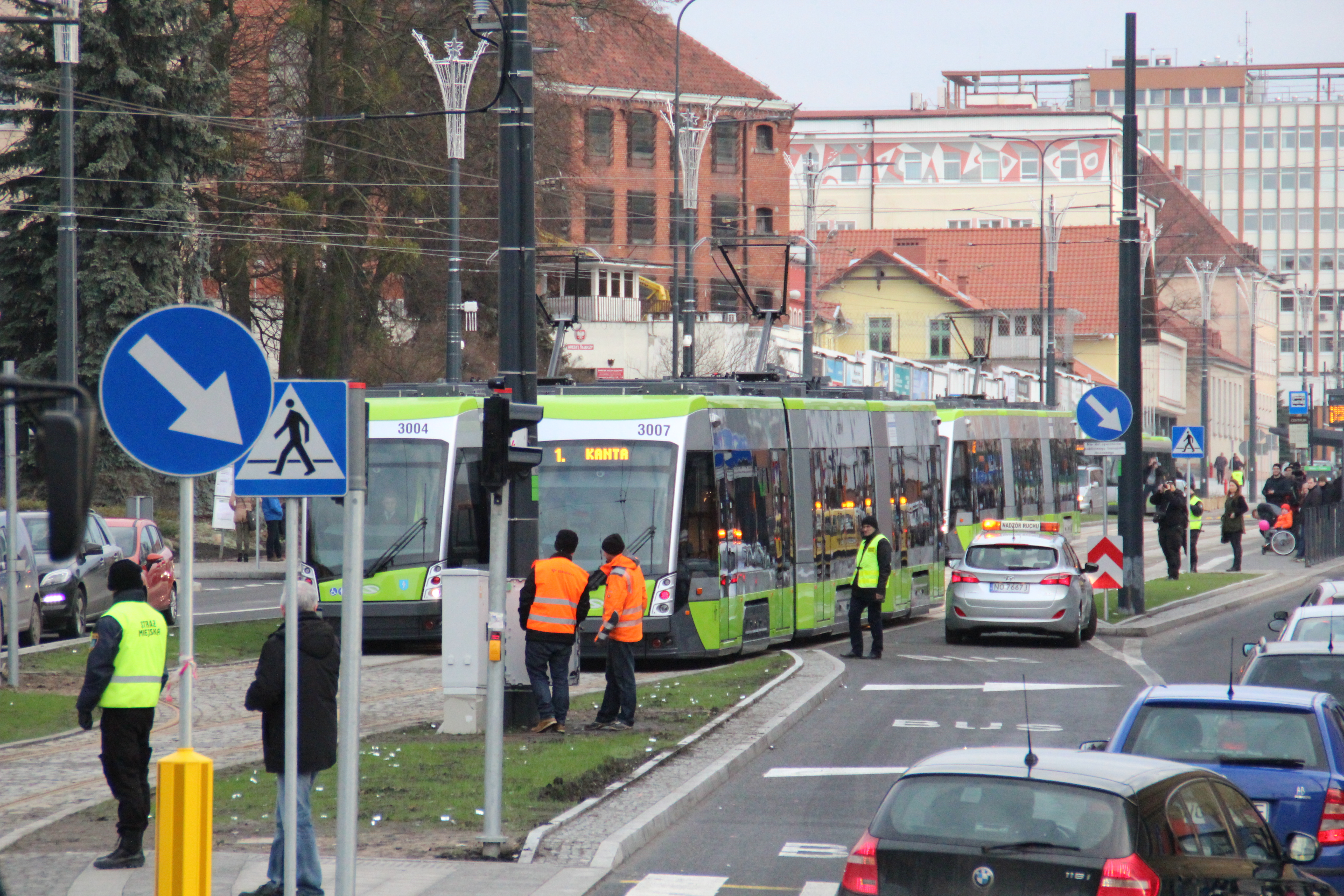 Solarisy Tramino Olsztyn S111O #3007, #3004 i #3002 (numer niewidoczny) mijają się przy przystanku Centrum (19 grudnia 2015) © OlsztyńskieTramwaje.pl