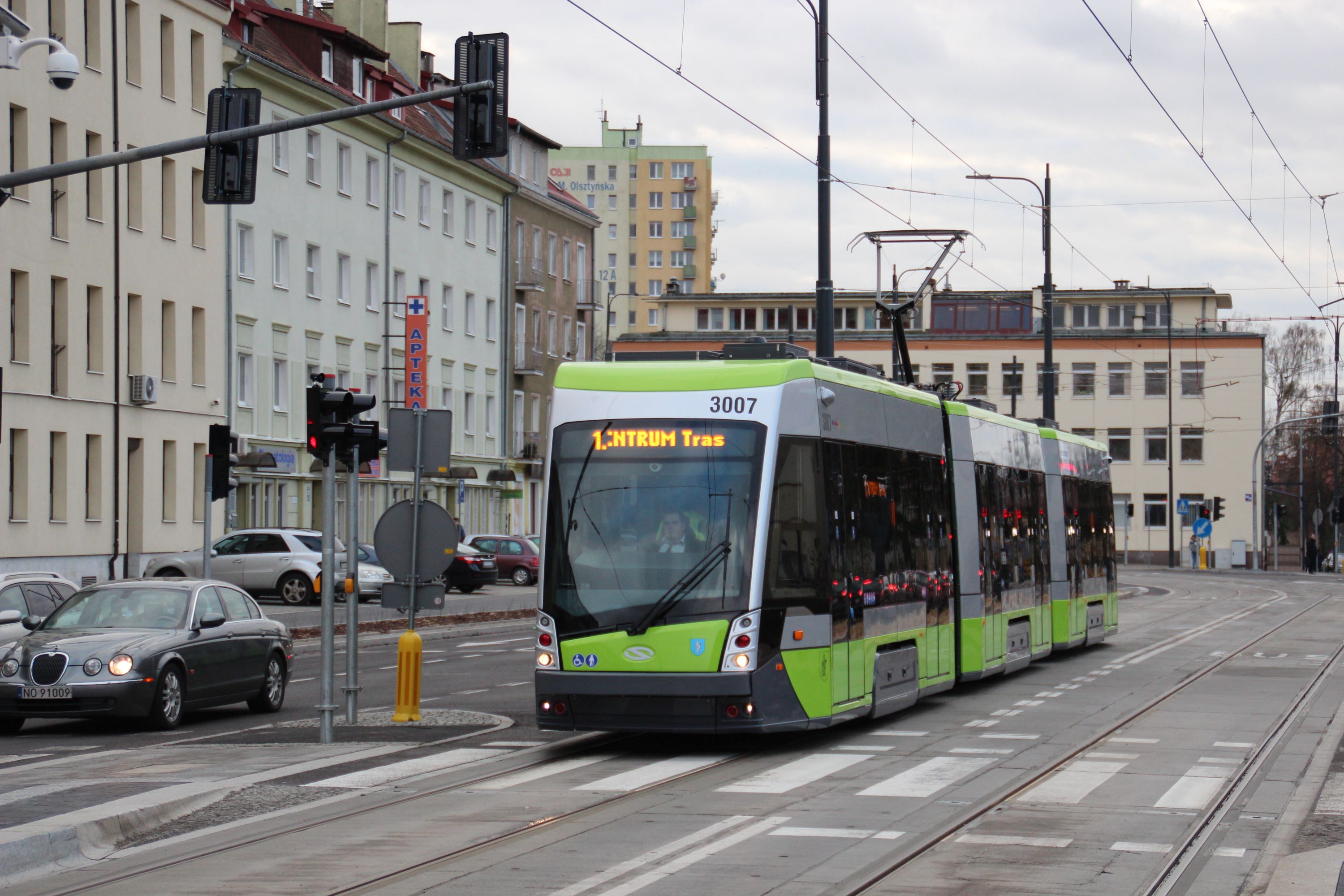 Solaris Tramino Olsztyn S111O #3007 na linii 1 zbliża się do przystanku Skwer Wakara (23 grudnia 2015) © OlsztyńskieTramwaje.pl