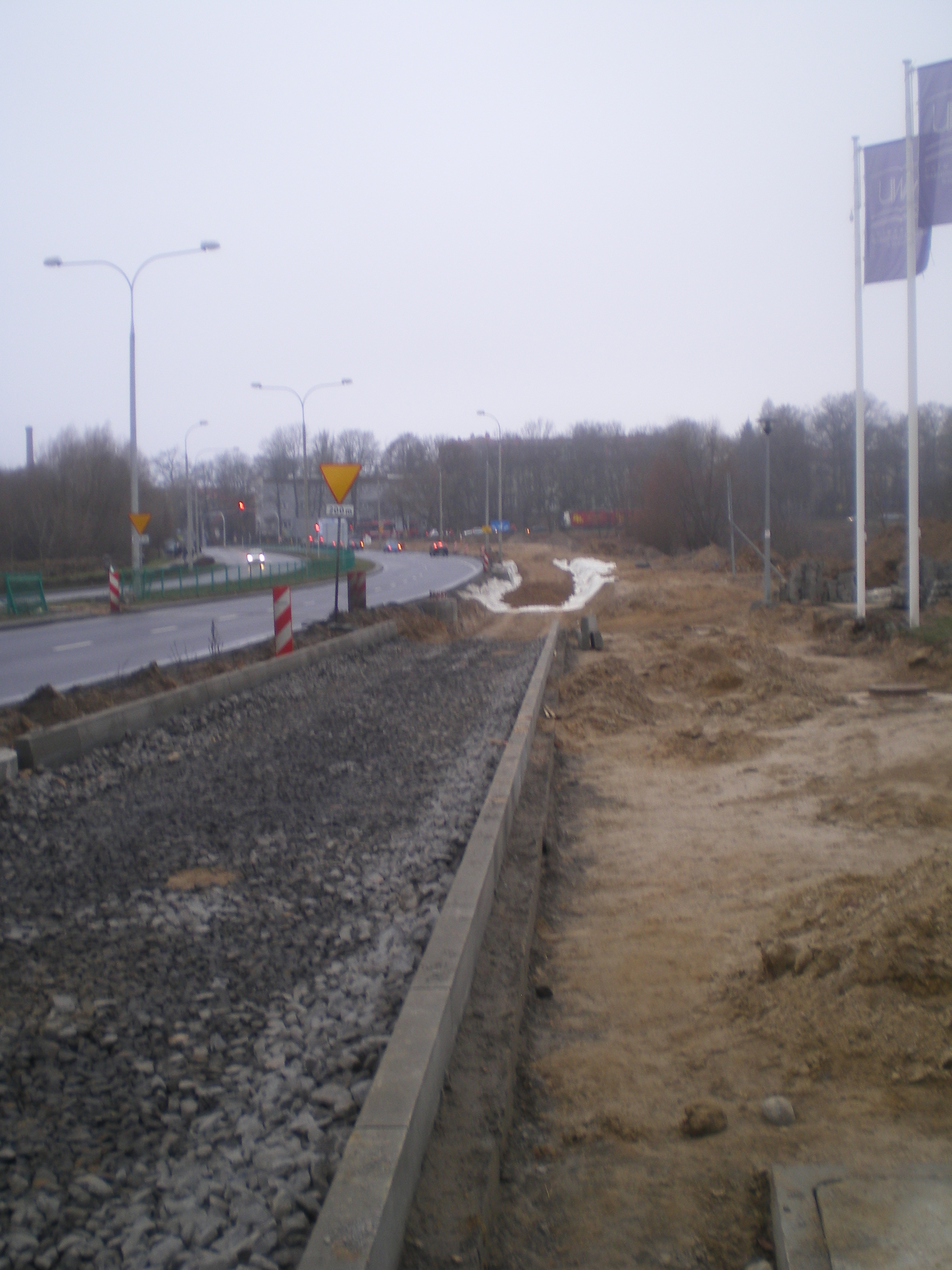 Przyszłe torowisko przy ulicy Tuwima na wysokości basenu uniwersyteckiego już wysypane tłuczniem (7 grudnia 2014) © OlsztyńskieTramwaje.pl