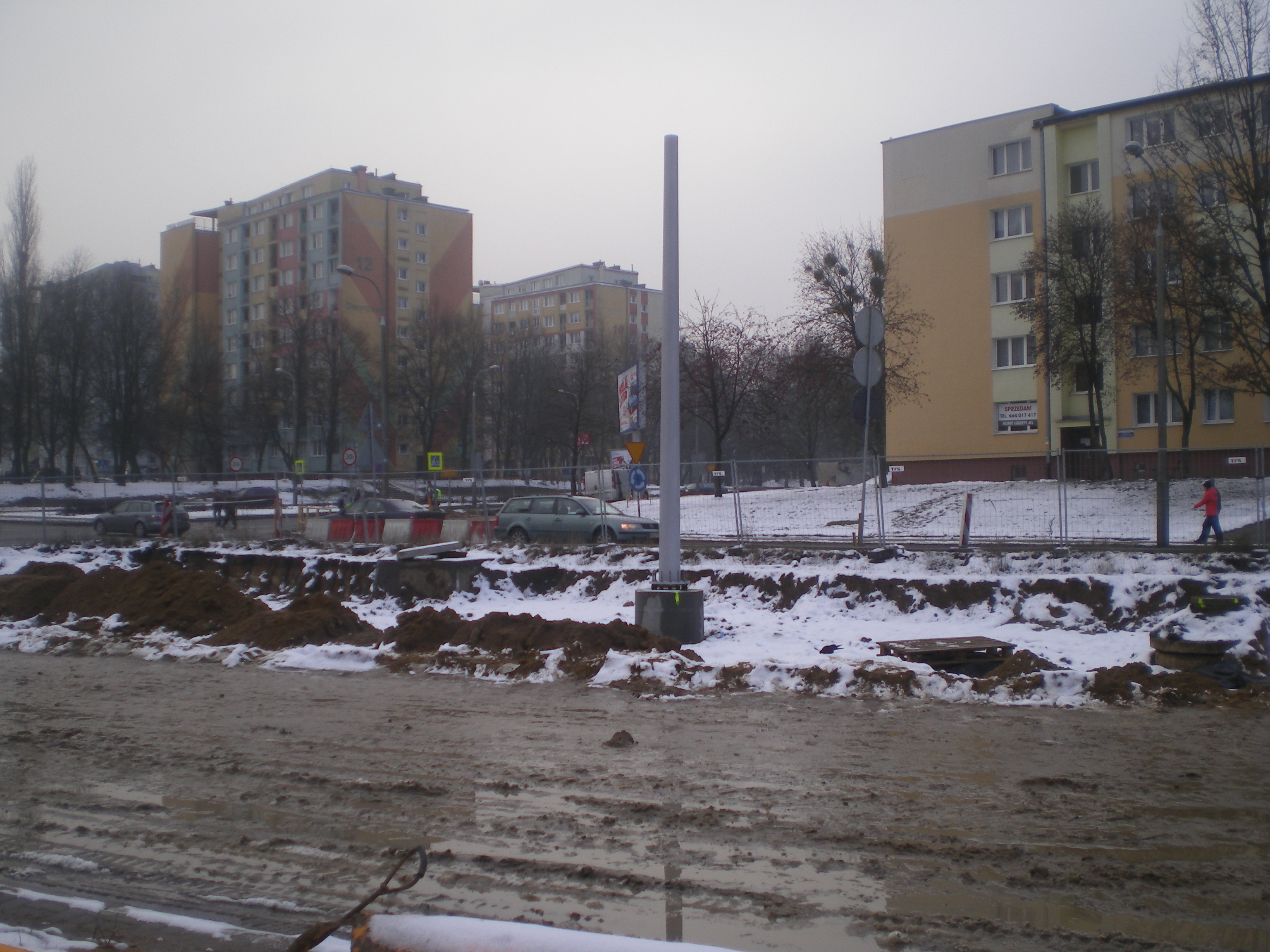 Słup trakcji tramwajowej na ulicy Dworcowej (22 stycznia 2015) © OlsztyńskieTramwaje.pl