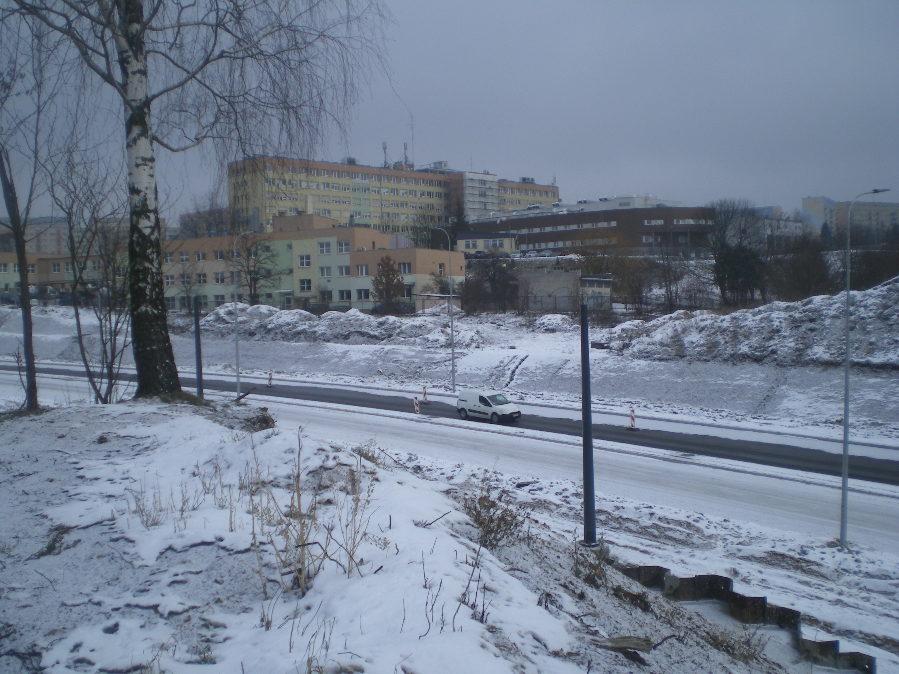 Słupy trakcji tramwajowej przy ulicy Obiegowej, w tle Szpital Wojewódzki (4 lutego 2015) © OlsztyńskieTramwaje.pl