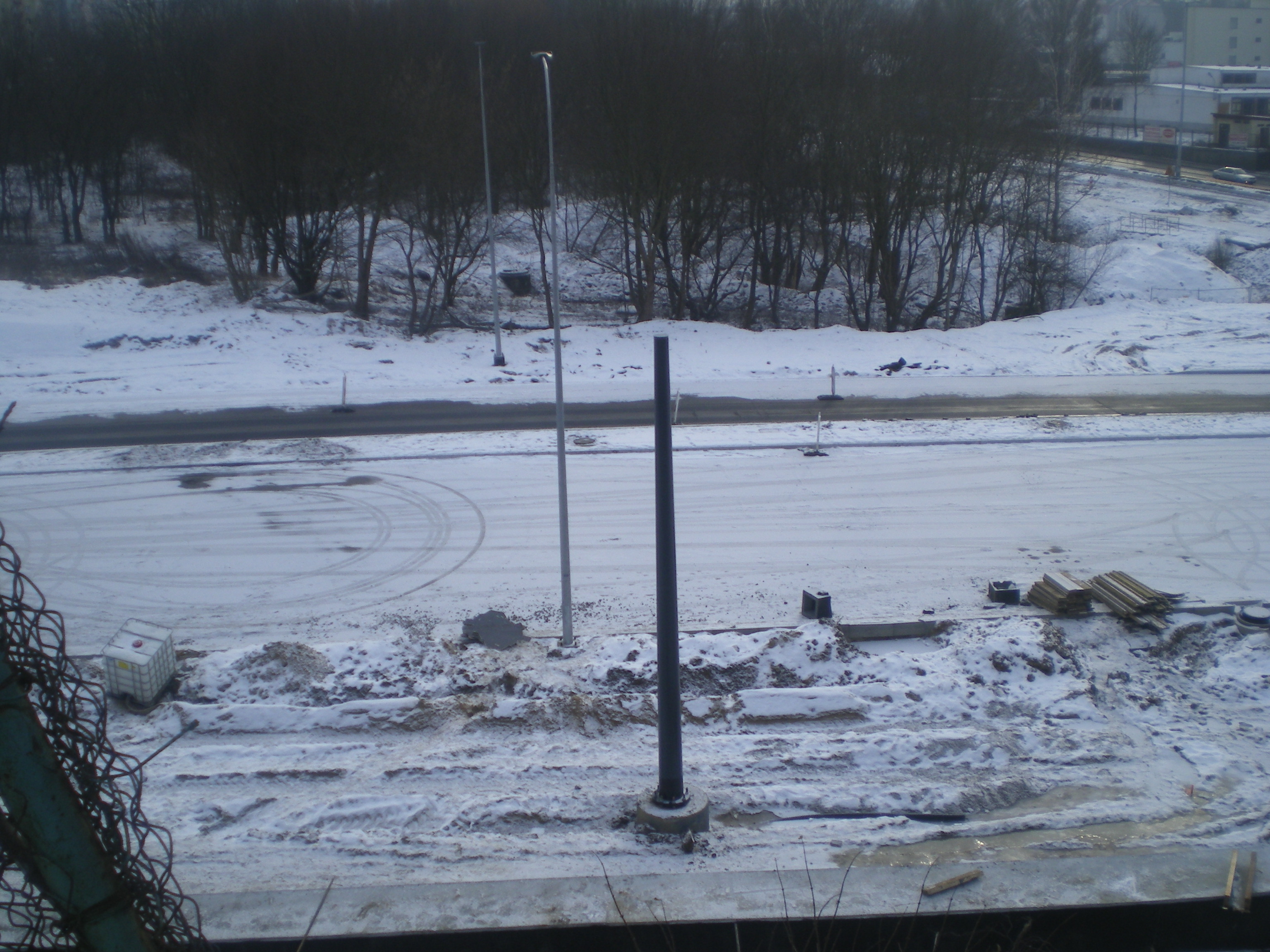 Słup trakcji tramwajowej przy ulicy Obiegowej (4 lutego 2015) © OlsztyńskieTramwaje.pl