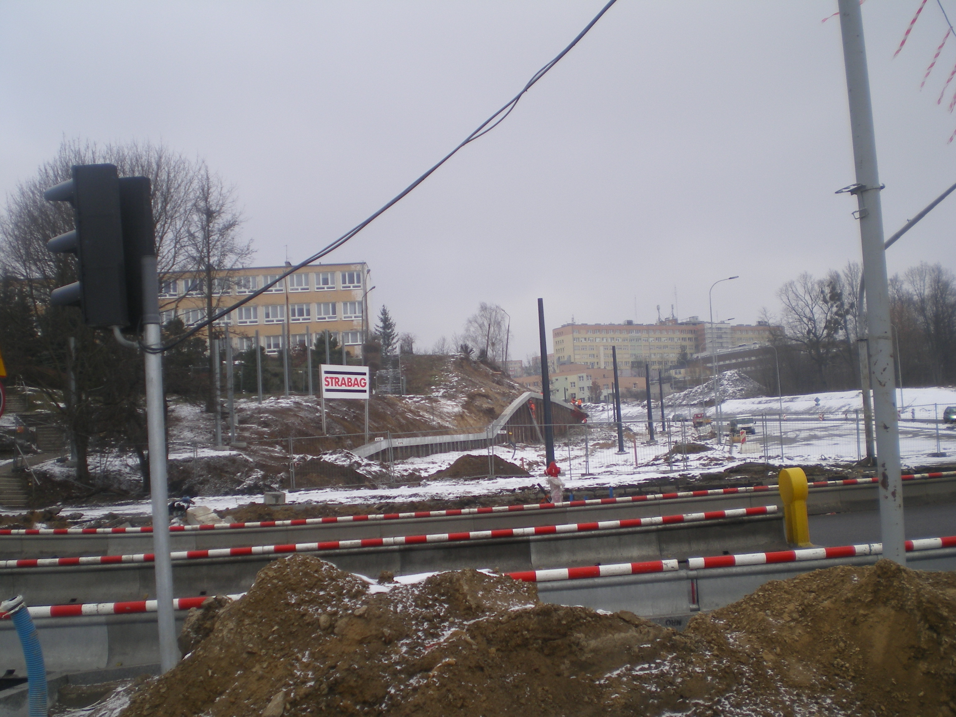Budowa linii tramwajowej przy skrzyżowaniu ulicy Obiegowej z ulicą Pstrowskiego i aleją Sikorskiego (4 lutego 2015) © OlsztyńskieTramwaje.pl