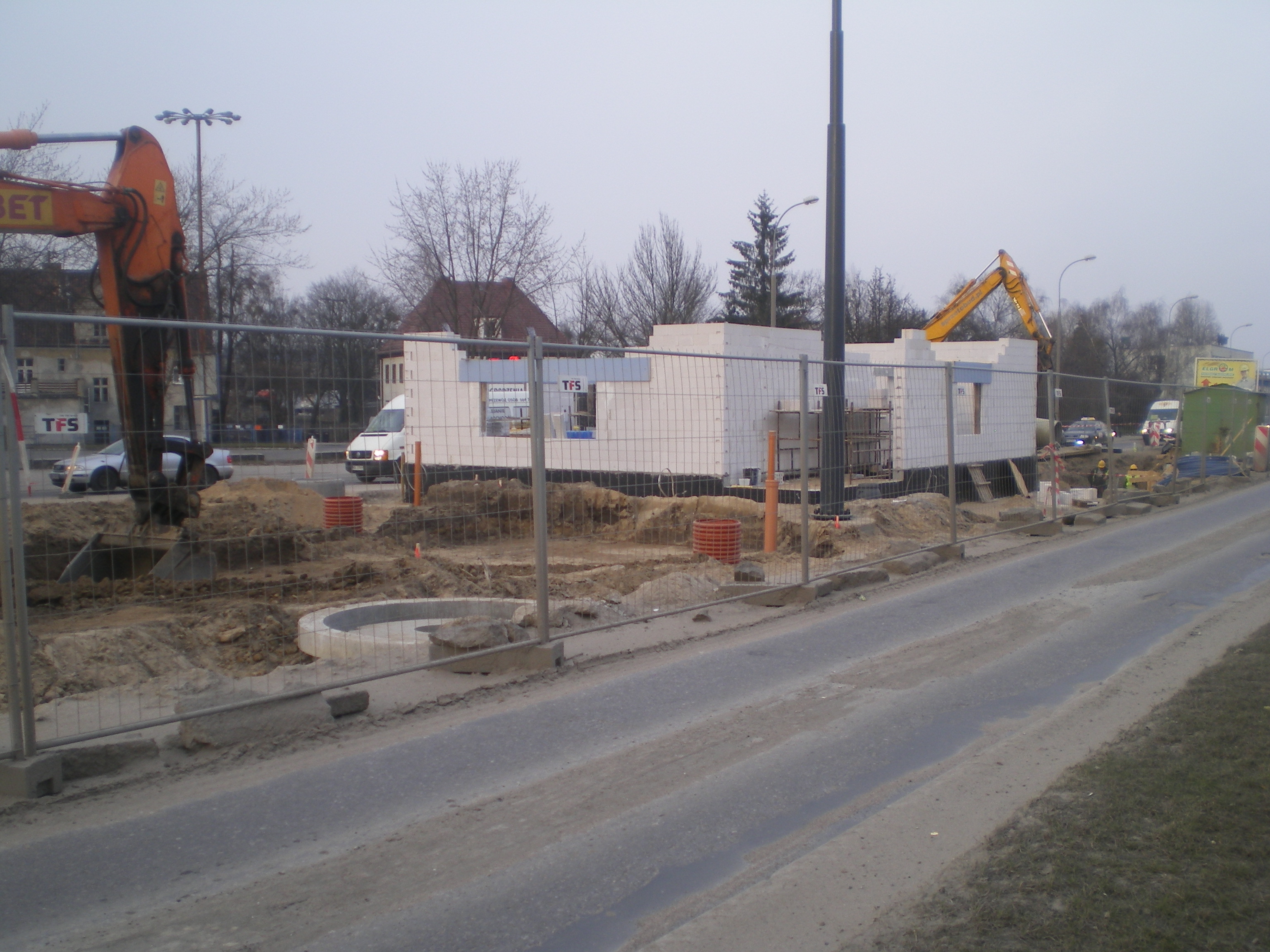 Budowa linii tramwajowej na placu Konstytucji 3 Maja (20 marca 2015) – budynek socjalny przy przystanku końcowym © OlsztyńskieTramwaje.pl
