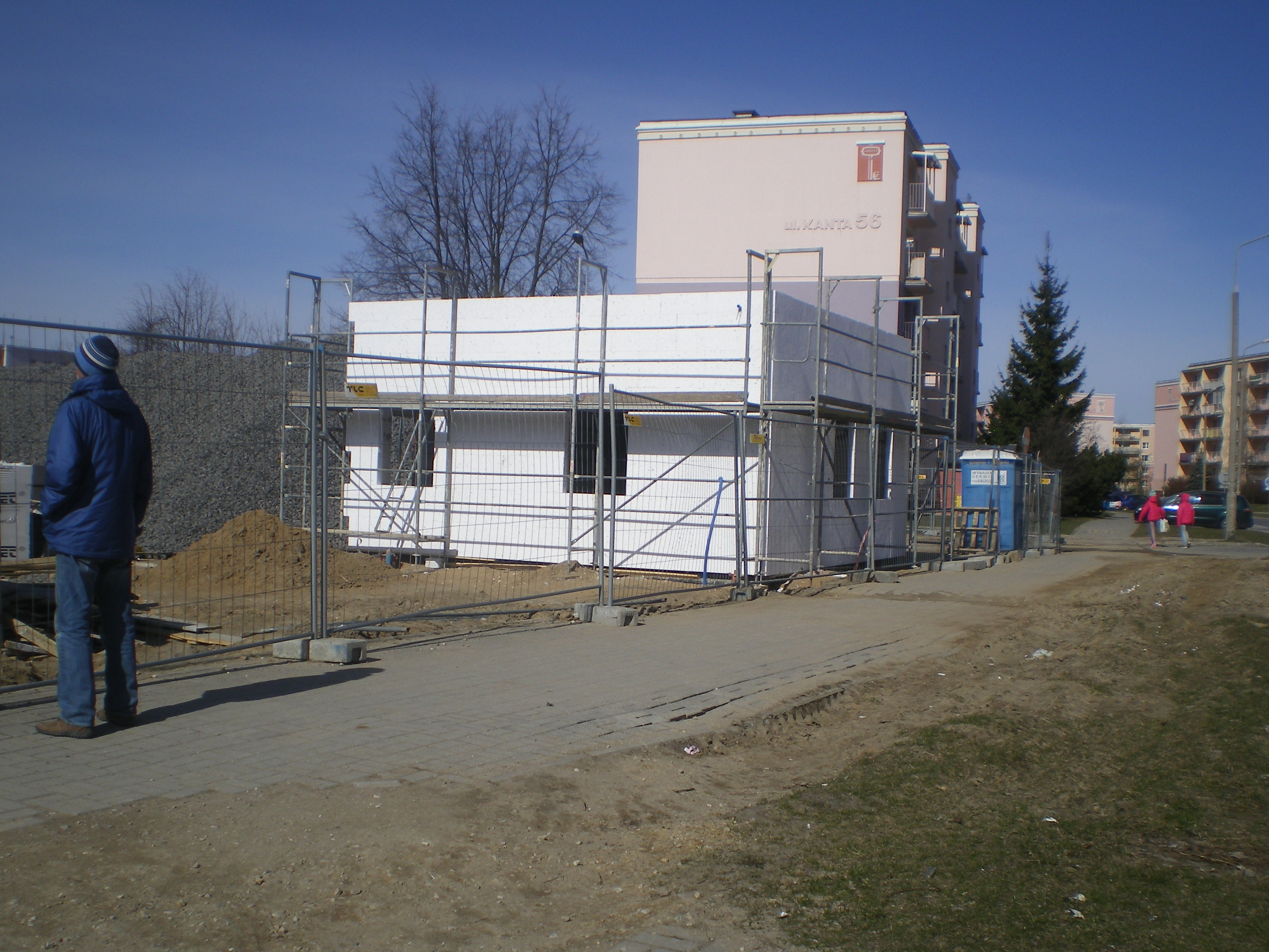 Budowa linii tramwajowej przy ulicy Witosa (22 marca 2015) – budynek socjalny przy przystanku końcowym przy skrzyżowaniu z ulicą Kanta © OlsztyńskieTramwaje.pl