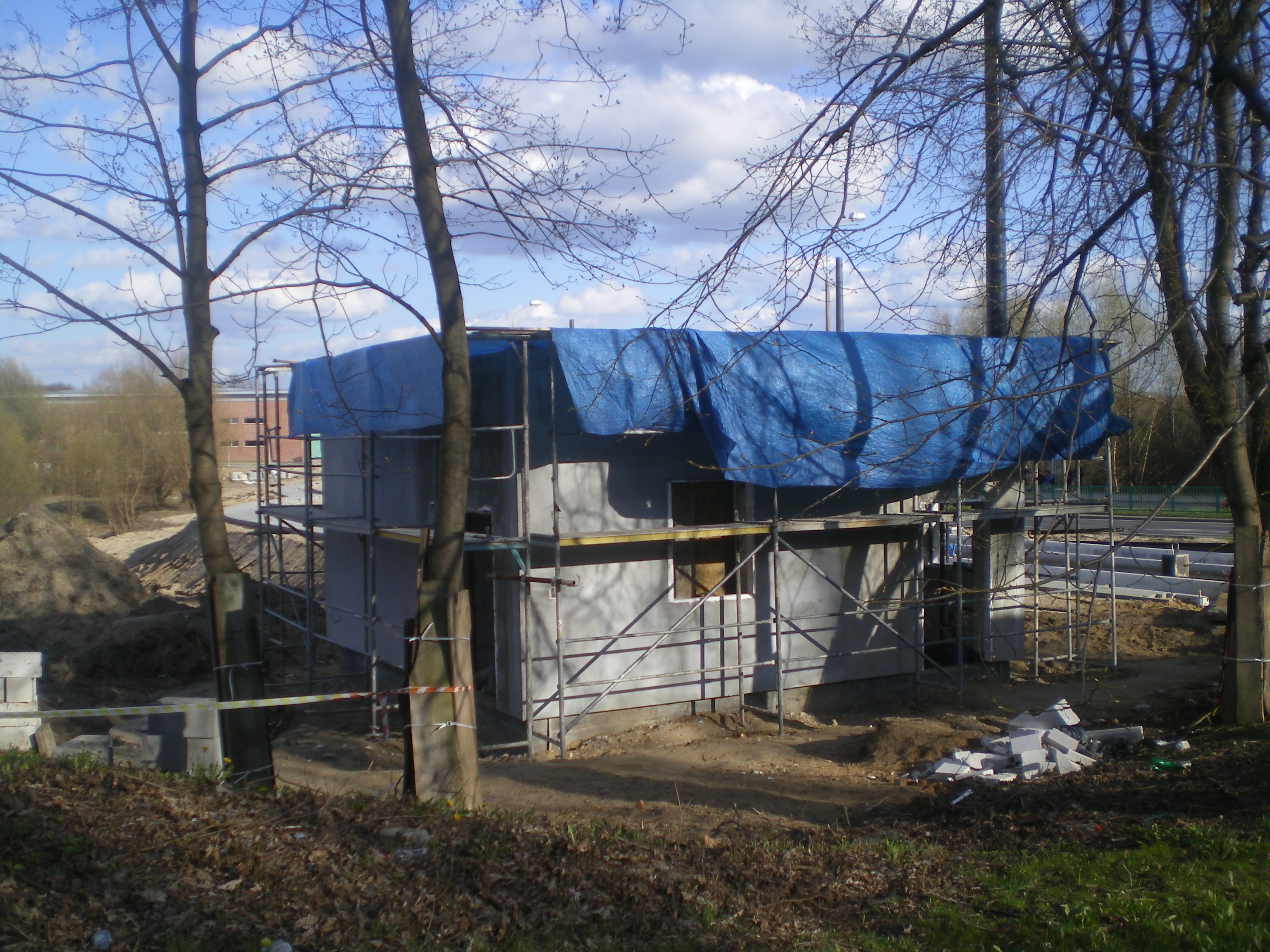 Budowa linii tramwajowej przy ulicy Tuwima (16 kwietnia 2015) – budynek socjalny dla motorniczych przy przystanku końcowym © OlsztyńskieTramwaje.pl