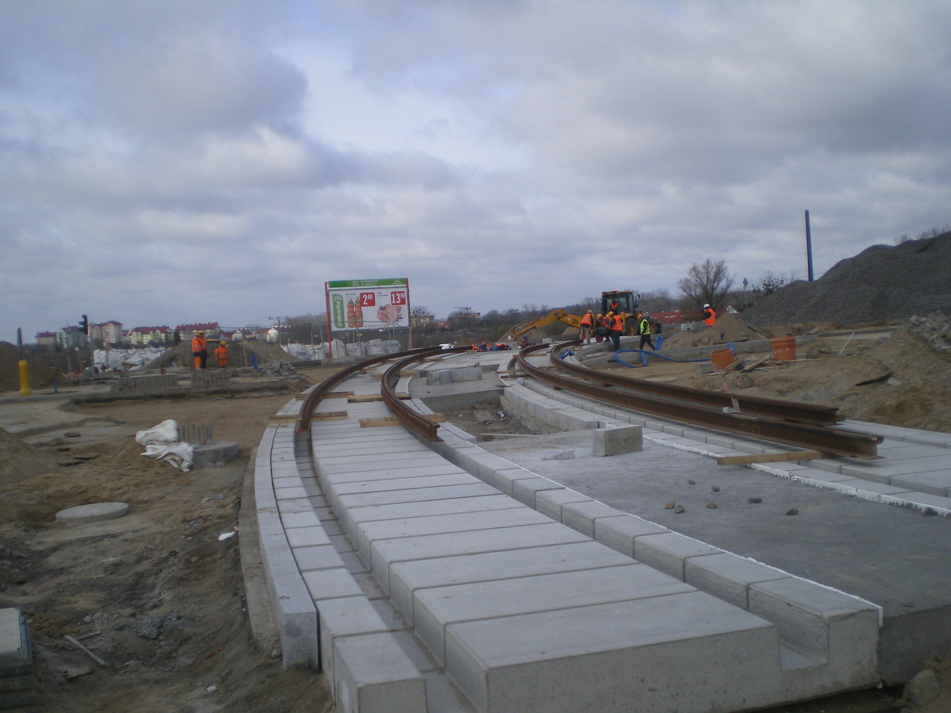 Budowa linii tramwajowej na skrzyżowaniu ulic Płoskiego, Witosa i Bukowskiego (17 kwietnia 2015)