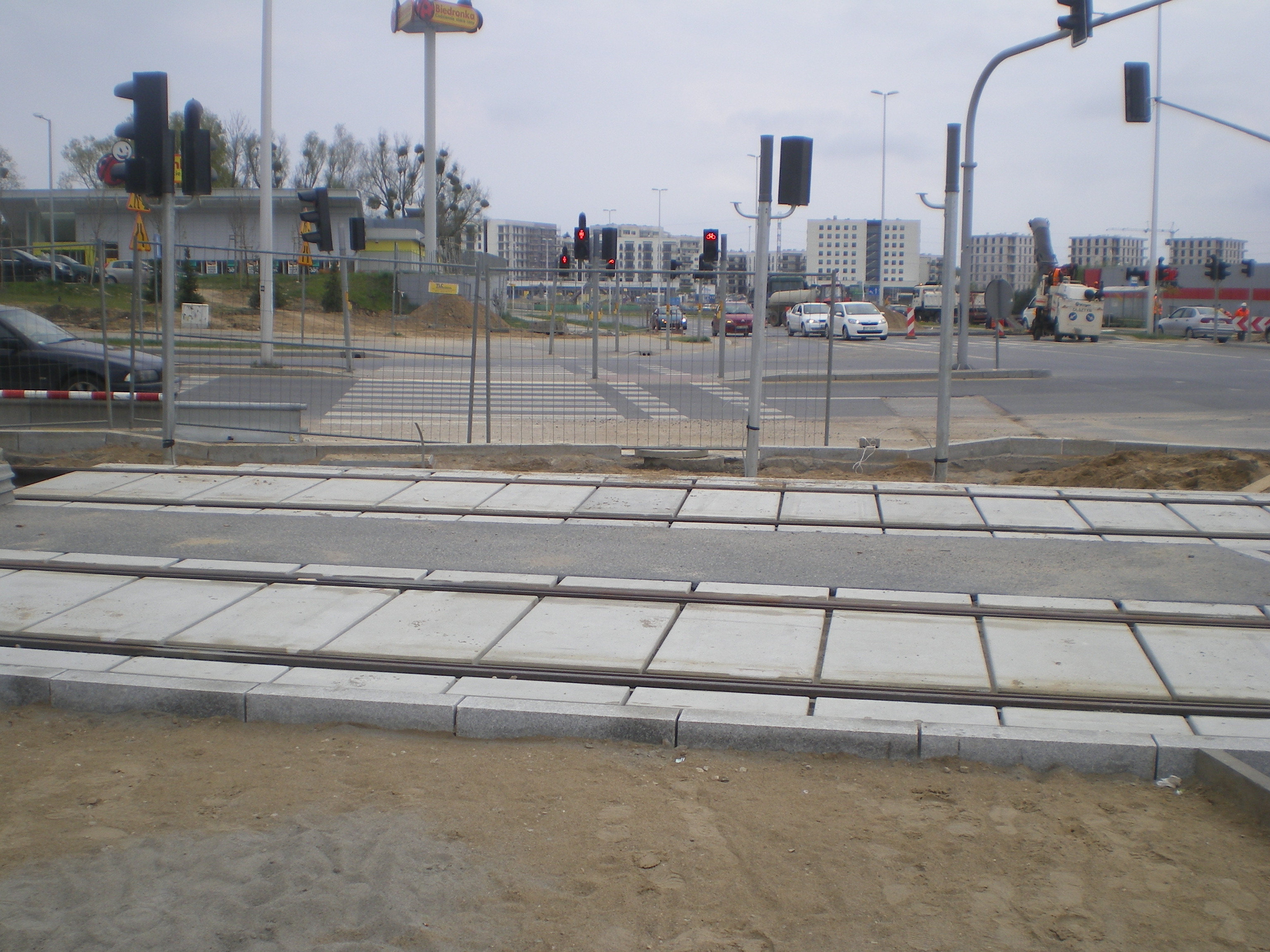 Budowa linii tramwajowej na skrzyżowaniu ulic Płoskiego, Witosa i Bukowskiego (28 kwietnia 2015)