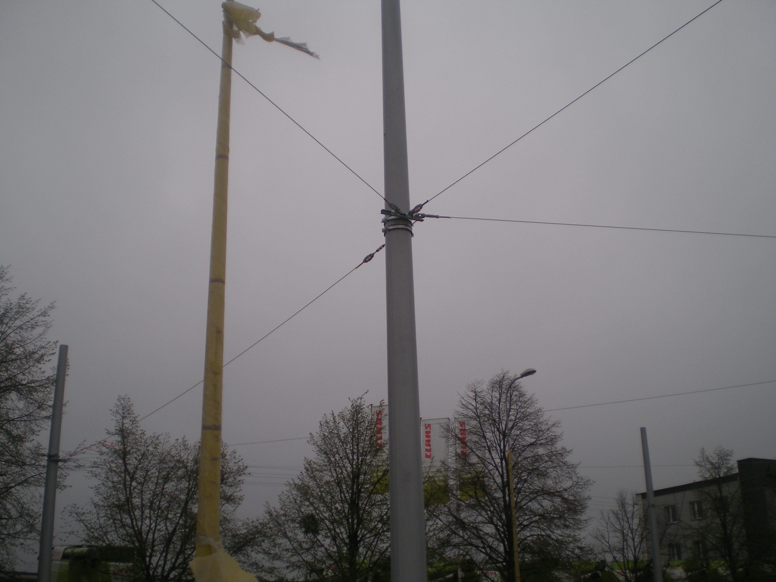 Budowa linii tramwajowej przy ulicy Towarowej (28 kwietnia 2015) – liny nośne sieci trakcyjnej przy wjeździe do zajezdni tramwajowej © OlsztyńskieTramwaje.pl