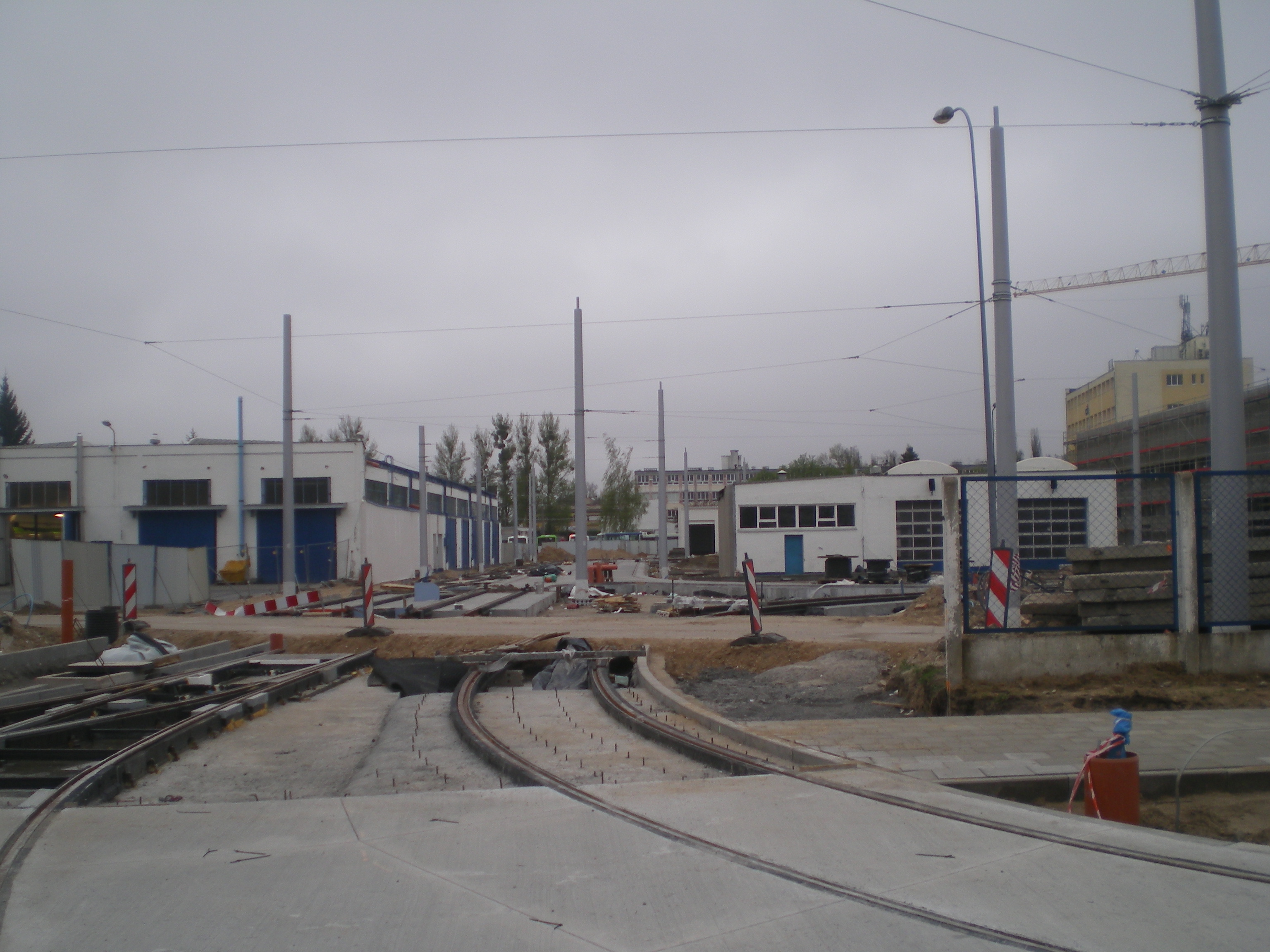 Budowa linii tramwajowej przy ulicy Towarowej (28 kwietnia 2015) – wjazd do zajezdni tramwajowej