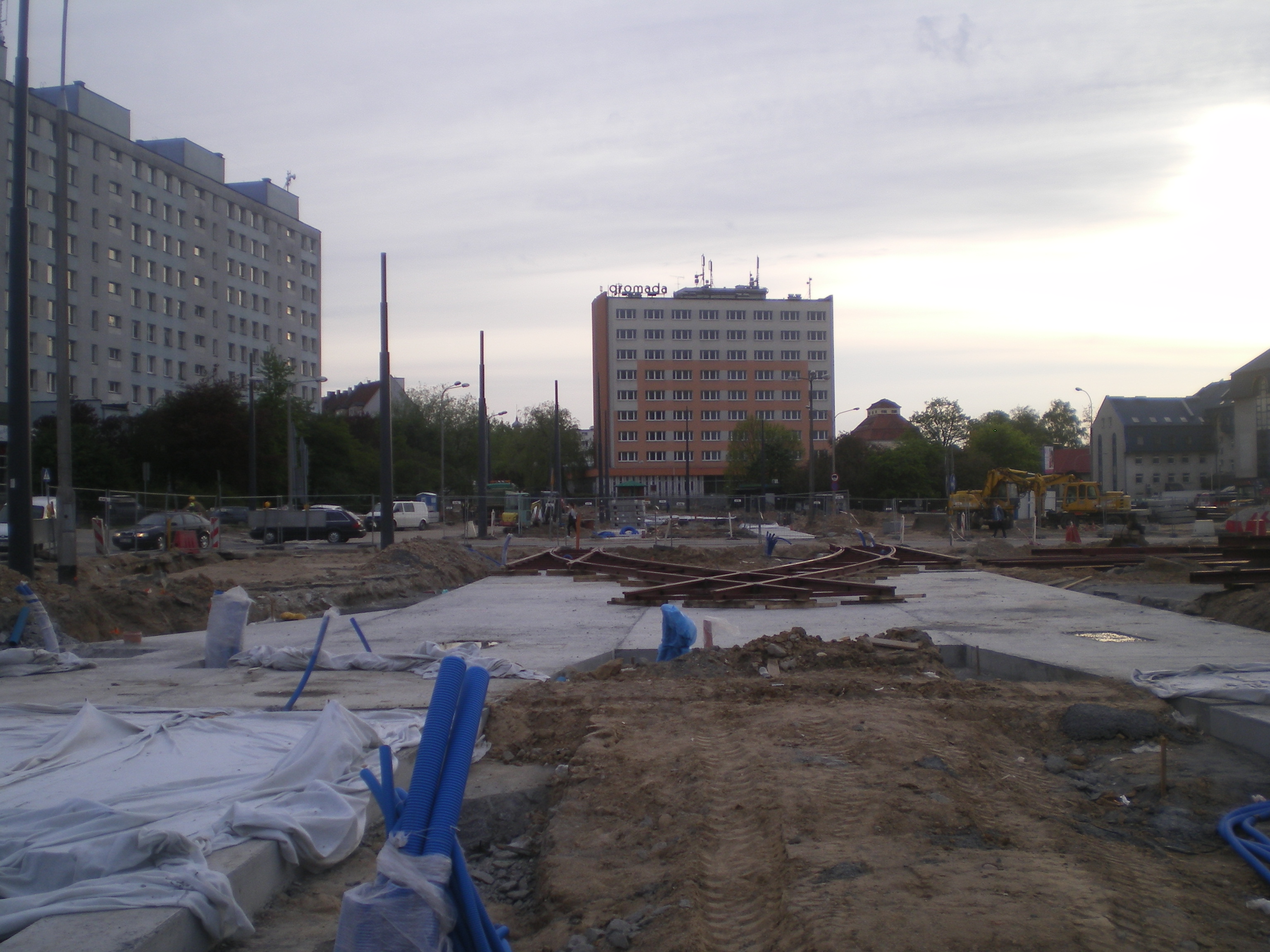 Budowa linii tramwajowej na placu Konstytucji 3 Maja (13 maja 2015) – miejsce przyszłych torów odstawczych © OlsztyńskieTramwaje.pl