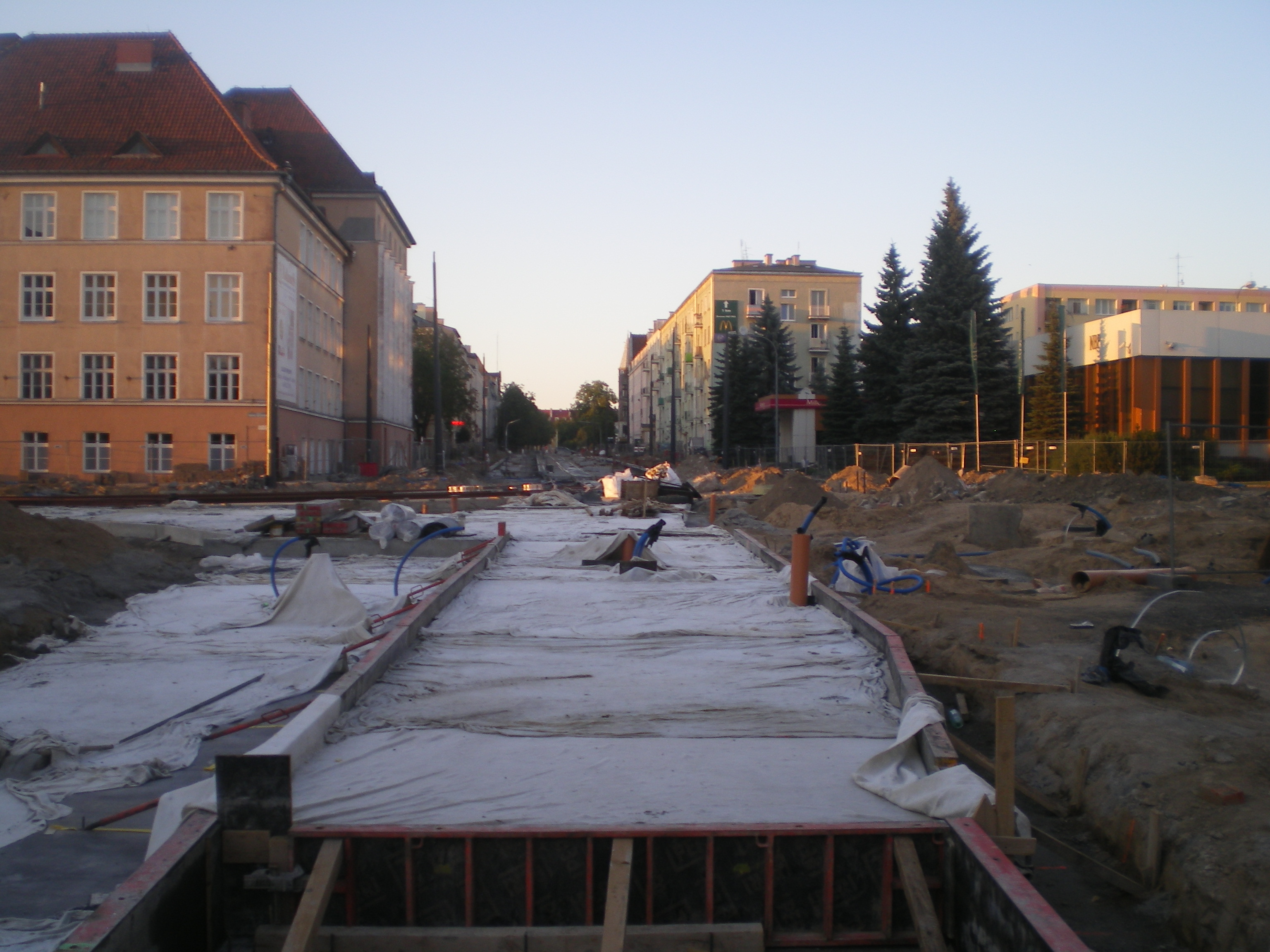 Budowa linii tramwajowej na skrzyżowaniu alei Piłsudskiego z ulicą Kościuszki (15 sierpnia 2015) © OlsztyńskieTramwaje.pl