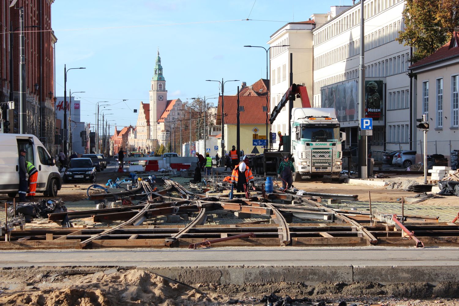 Budowa linii tramwajowej na skrzyżowaniu ulic Kościuszki z aleją Piłsudskiego (3 listopada 2022) © OlsztyńskieTramwaje.pl