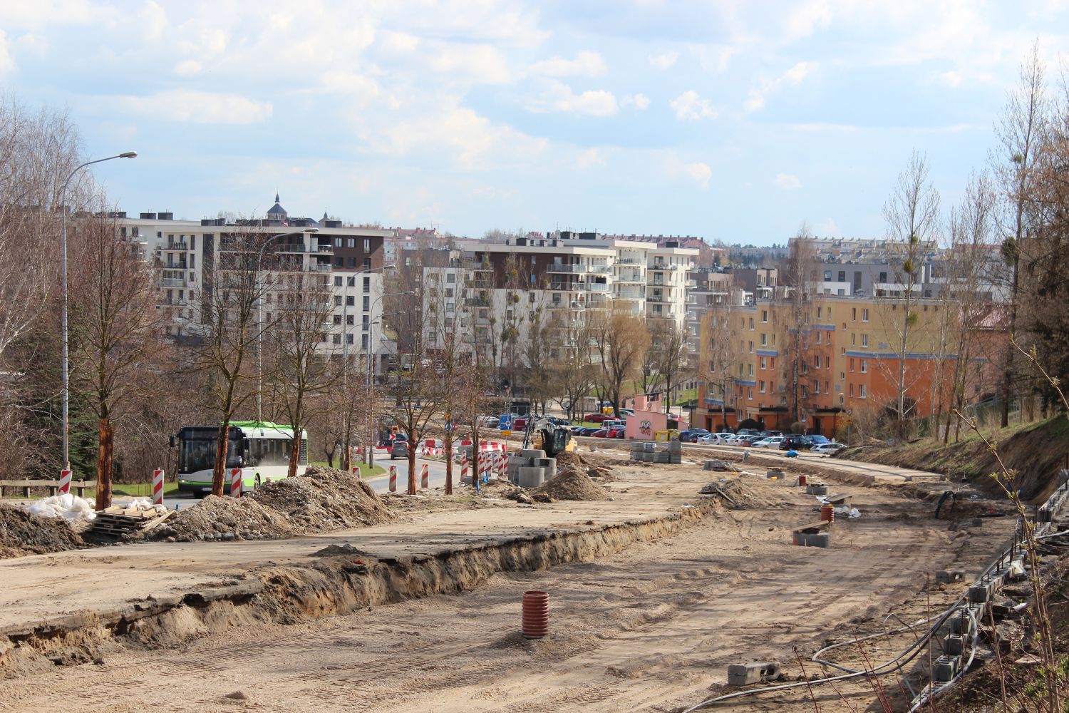Budowa linii tramwajowej w ulicy Krasickiego, między ulicami Wańkowicza i Barcza (10 kwietnia 2023) © OlsztyńskieTramwaje.pl