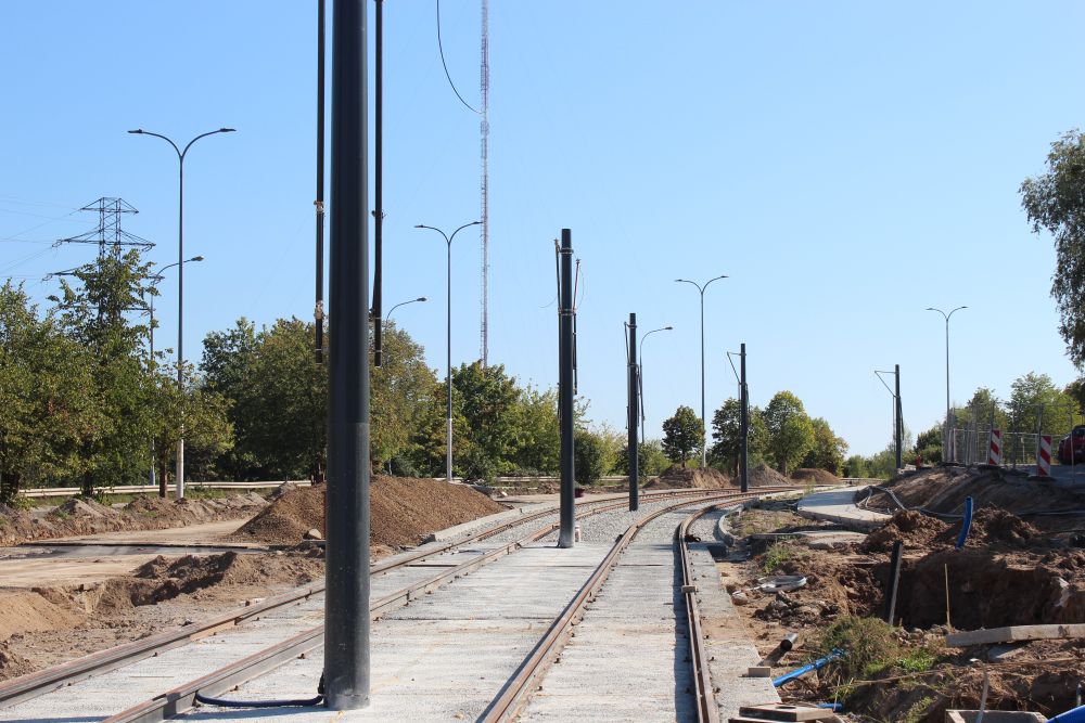 Budowa linii tramwajowej w ulicy Krasickiego, w pobliżu skrzyżowania z ulicą Murzynowskiego (17 września 2023) © OlsztyńskieTramwaje.pl