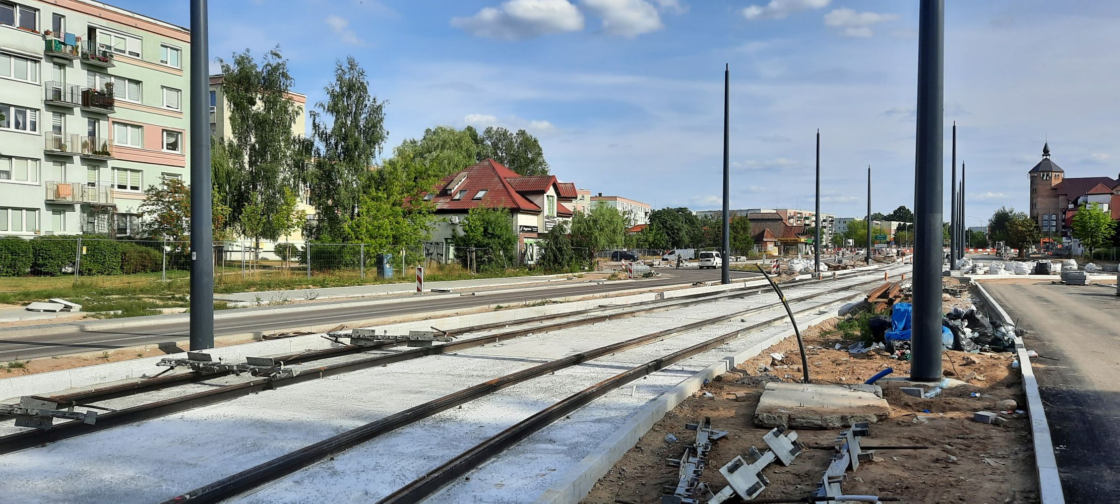 Budowa linii tramwajowej w ulicy Krasickiego, w pobliżu skrzyżowania z ulicami Sobocińskiego i Boenigka (29 lipca 2023) © OlsztyńskieTramwaje.pl