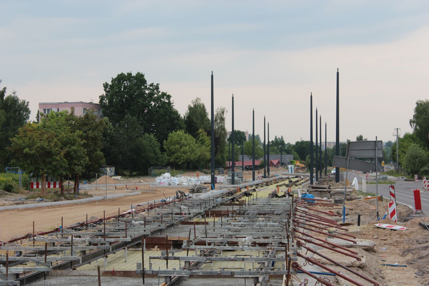 Budowa linii tramwajowej w ulicy Krasickiego, w pobliżu skrzyżowania z ulicą Wilczyńskiego (5 lipca 2023) © OlsztyńskieTramwaje.pl
