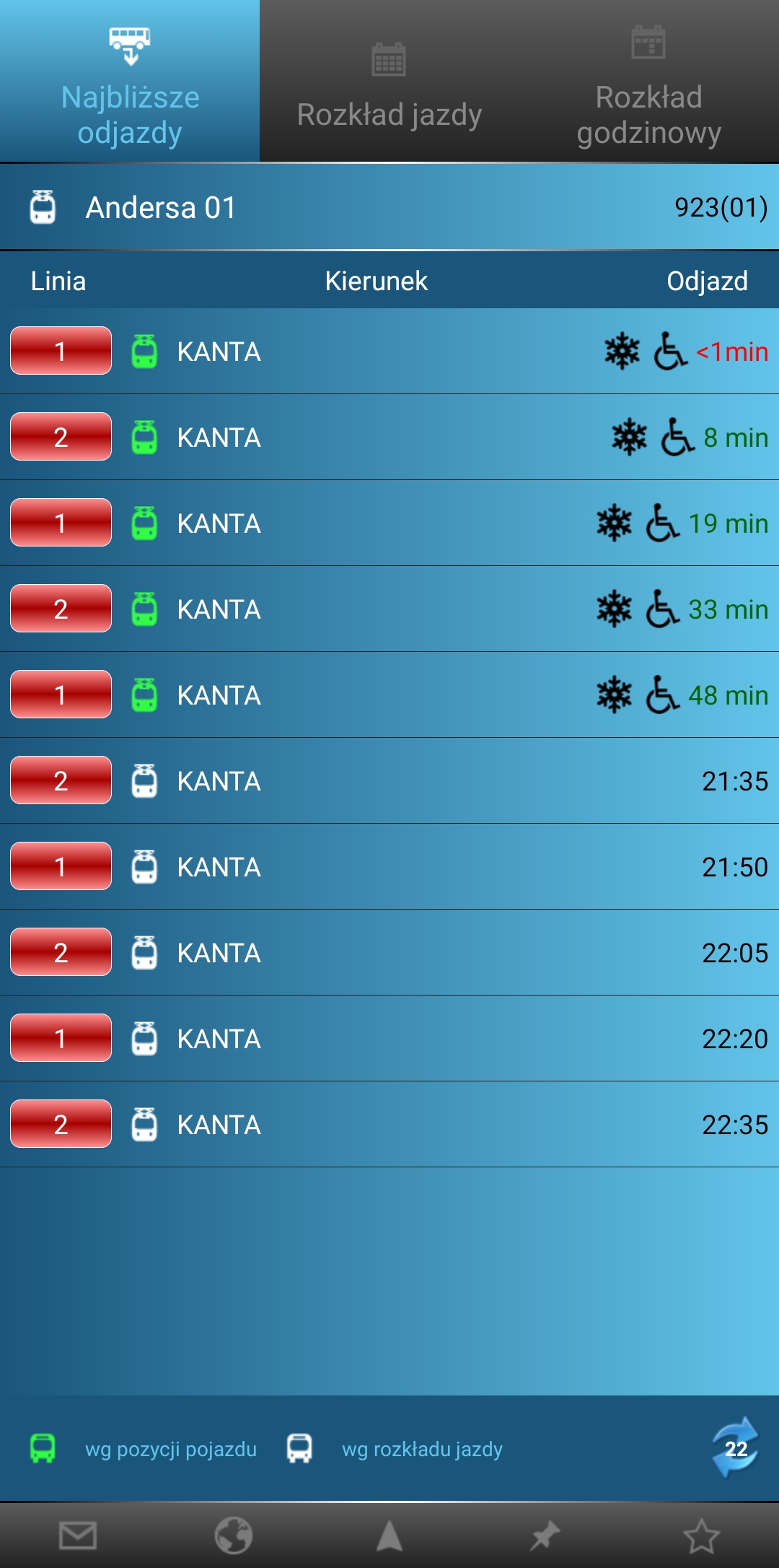 Lista odjazdów z przystanku w aplikacji MyBus (przystanek Andersa 01)