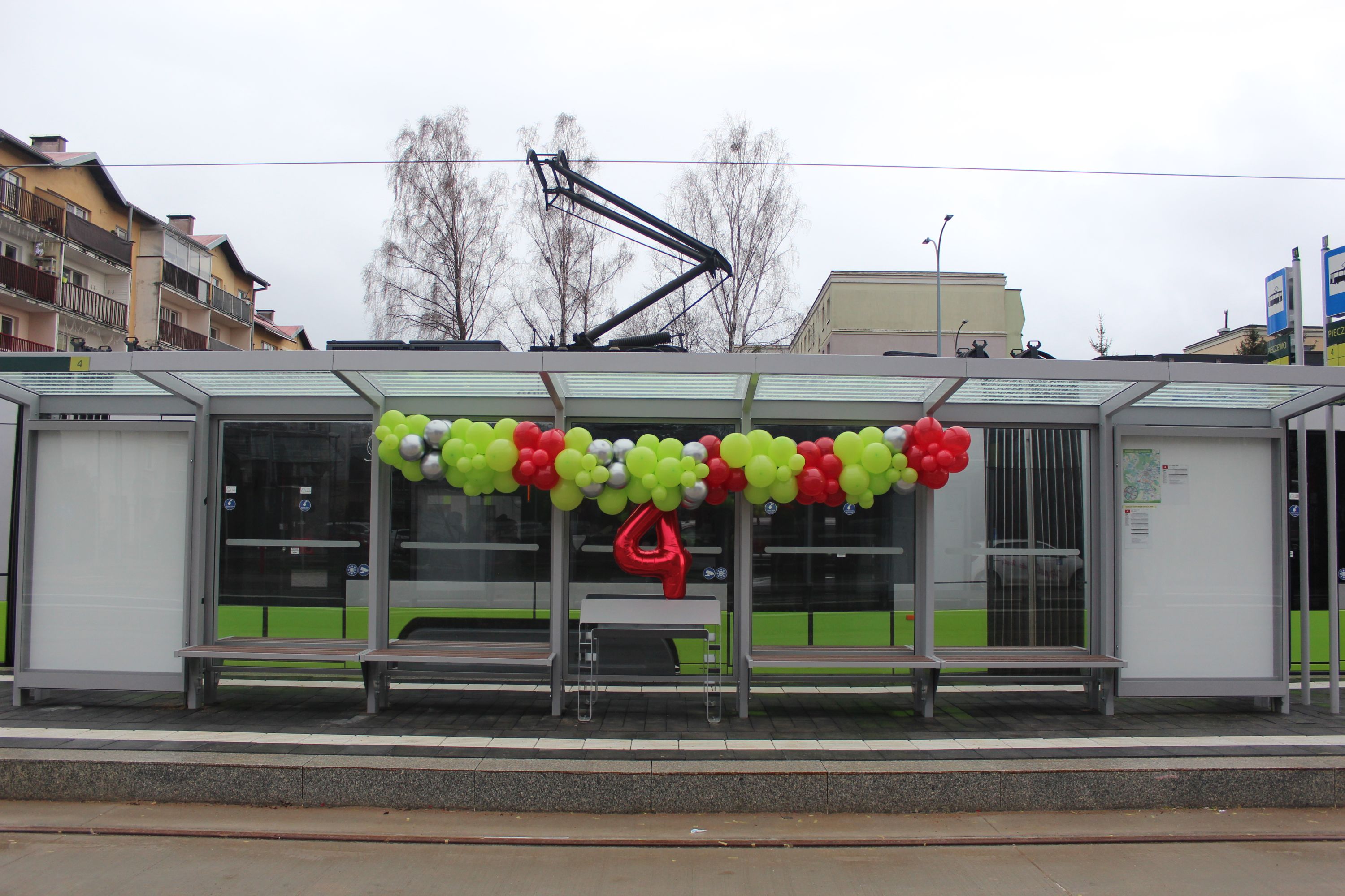 Udekorowana wiata przystankowa na peronie linii 4 na przystanku końcowym Pieczewo podczas inauguracji trasy tramwajowej na Pieczewo (30 grudnia 2023) © OlsztyńskieTramwaje.pl