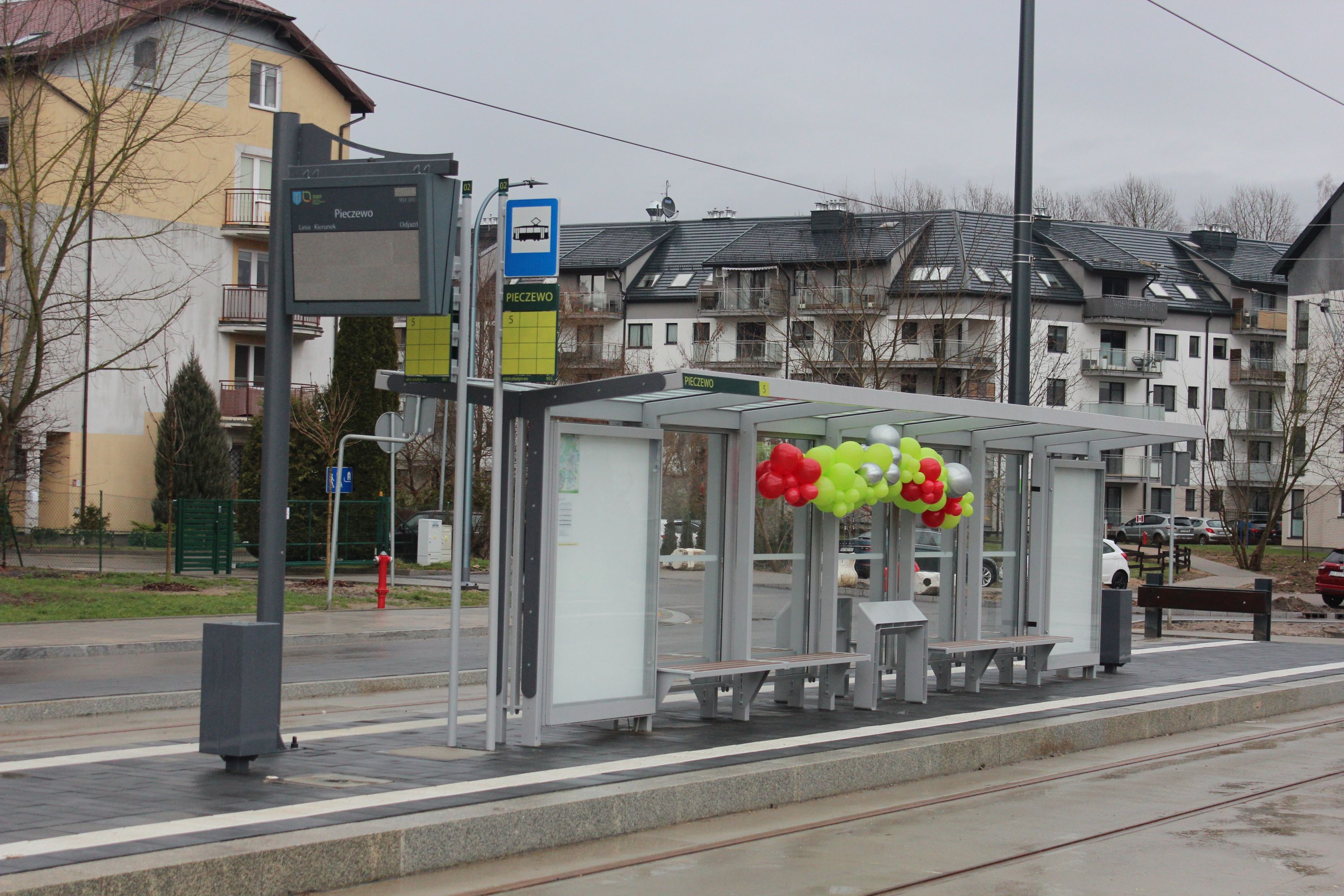 Udekorowana wiata przystankowa na peronie linii 5 na przystanku końcowym Pieczewo podczas inauguracji trasy tramwajowej na Pieczewo (30 grudnia 2023) © OlsztyńskieTramwaje.pl