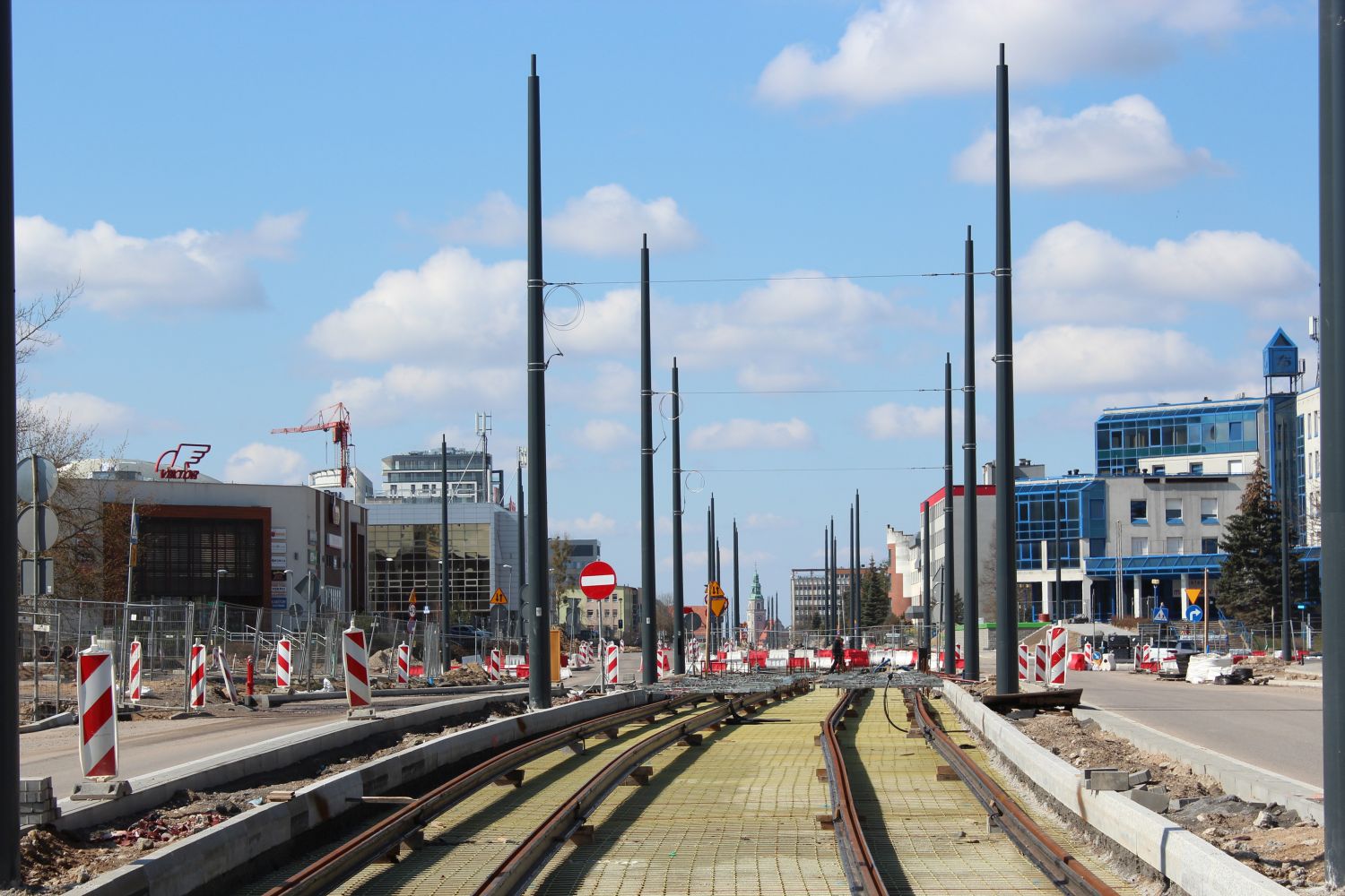 Budowa linii tramwajowej w alei Piłsudskiego, w pobliżu placu Inwalidów Wojennych (10 kwietnia 2023) © OlsztyńskieTramwaje.pl